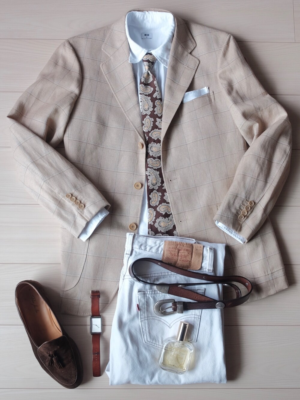 シンプルにホワイトとブラウンでまとめたスタイルです。 コンチョベルトで外し、501とオックスフォードのボタンダウンでカジュアル感を足しバランスをとりました。