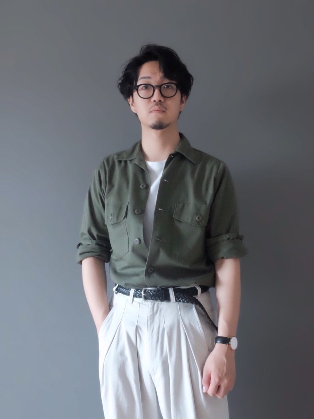 ミリタリーシャツをラギッドになりすぎないように着ました。