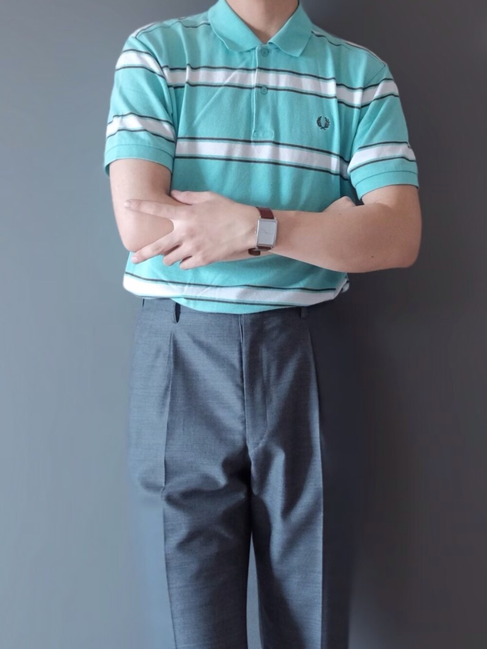 グリーンのポロシャツをメインにしたスタイルです。 ボーダーのブラウンを時計と靴でひろっています。 オーダーしたグレーのスラックスで大人っぽさをプラスしました。