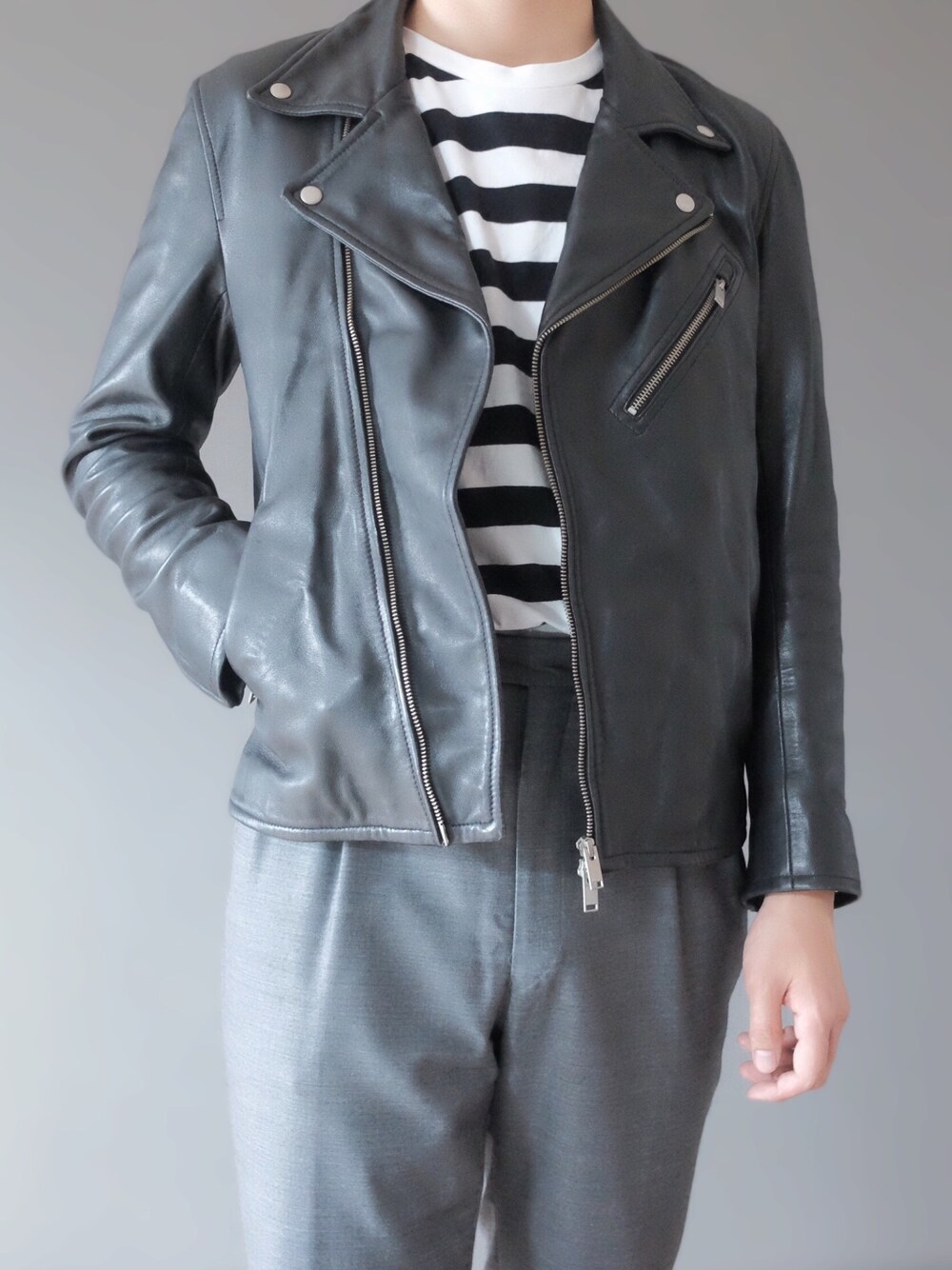 ハードなライダースにきれいめなアイテムを合わせて上品に着こなしました。