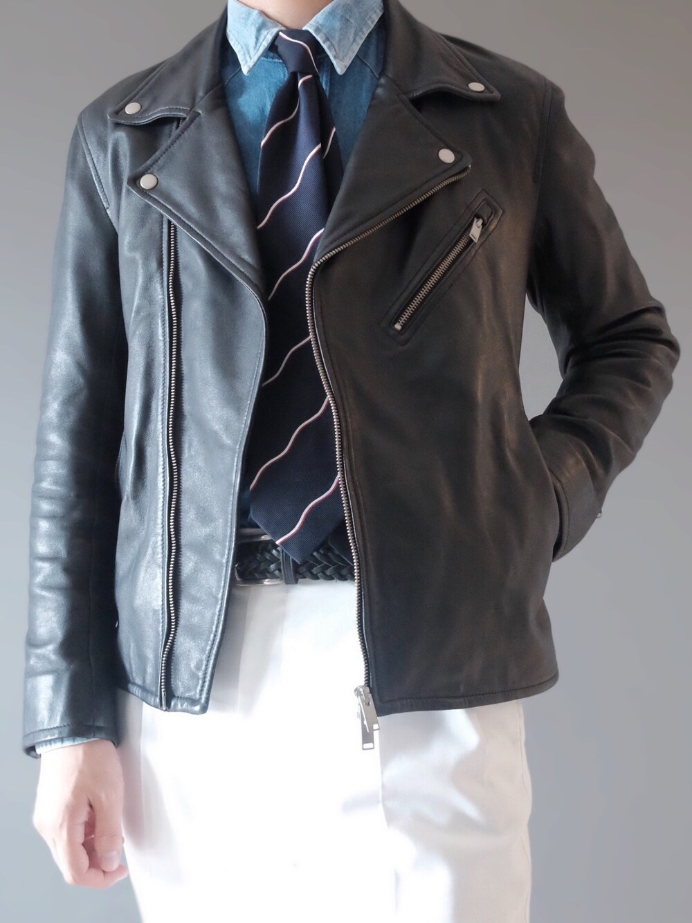 ライダースとウエスタンシャツをタイドアップで合わせました。