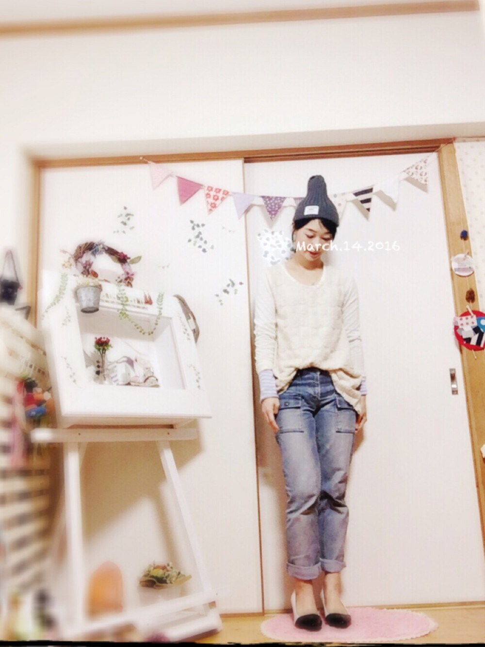 今日も肌寒い〜〜 ハンドメイド出店する日まで残り一週間になりちょっと焦ってますが・・・ 息抜きにコーデアップします😊 昨日、必要な物をいろいろ買い出しに行った時に ぷらっと寄ったしまむらで・・・ 見つけちゃいました😆↗️↗️ ニット帽、50円‼️‼️ ホントかな?と何度か見直しました😳 ニット帽はいくつ持ってても欲しい‼️ って事で50円だし、持ってなかった グレーをゲットしました😽 maruちゃん、早速50円ニット帽アップしたからねー😁 昼からはまたチクチクチク頑張ります✊🏻 トップスは、 前はレース素材になってて、お気に入りの一枚です♪