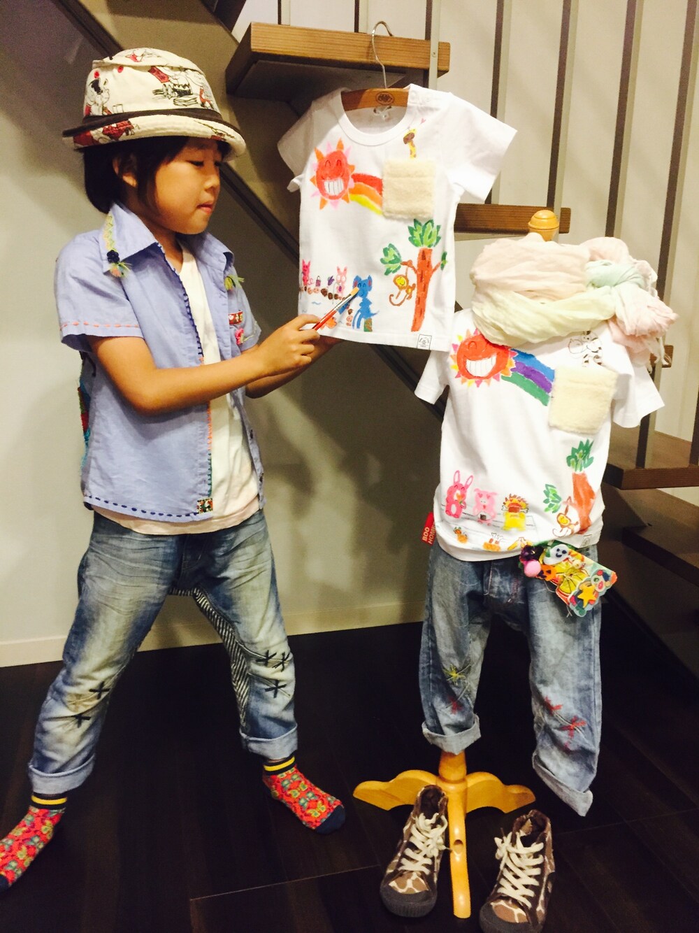 息子によるTシャツアート第7•8段は、4歳と1歳の兄弟くんへ♪♪ 友人であるママより 「アツの描く太陽や動物が好き」とのリクエスト。 白Tに描くと絵の具がまた映える(o^^o) ちなみに息子着のシャツは、5年前のブーフーウーキッズデザイナーコンテストでアツのデザイン画を選んでいただき、インドの職人さんの手によって作っていただいたもの。 気付けばジャストサイズ‼︎飾っているだけじゃもったいないのでヘビロテ中♡ やっぱりオリジナル作品っていいな。 って、私リメイクとかできないけど。苦笑