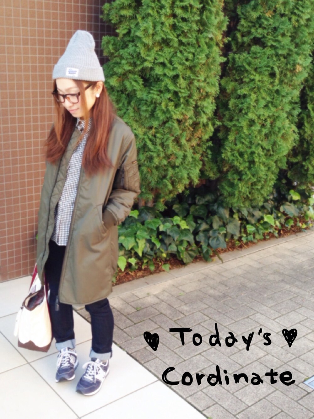 2014.10.19 Code❥ ニット帽❥ AnotherEdition ピアス❥ mystic MA-1❥ AnotherEdition ギンガムシャツ❥ 無印良品 ジーンズ❥ UNIQLO バッグ❥ しまむら スニーカー❥ newbalance MA-1に初挑戦しました◡̈♡