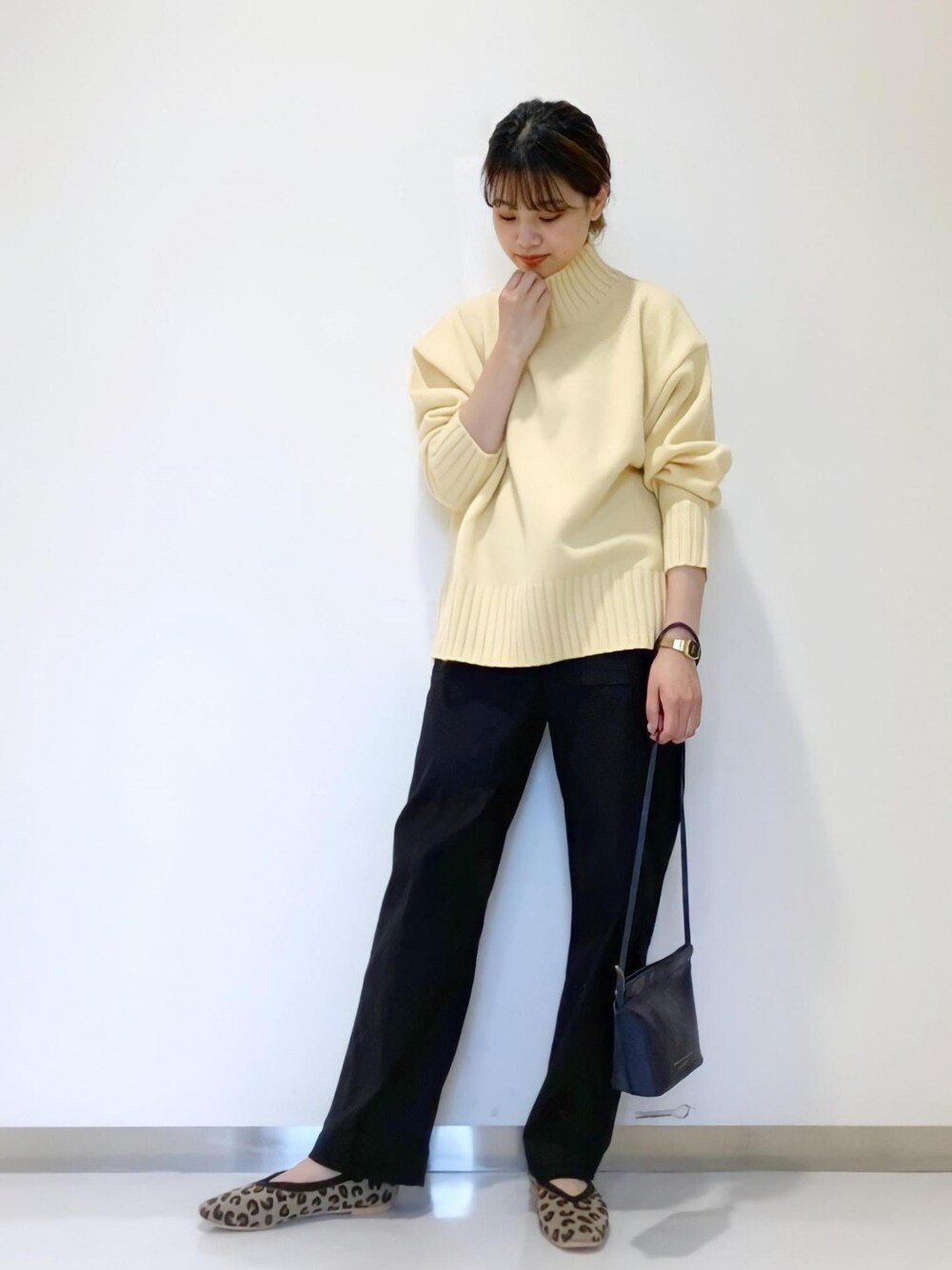 柔らかいクリームカラーのニットとブラックのベイカーパンツでシンプルながらこなれ感のある印象のコーデに♪ 足元のレオパード柄のバレエシューズをポイントに。
