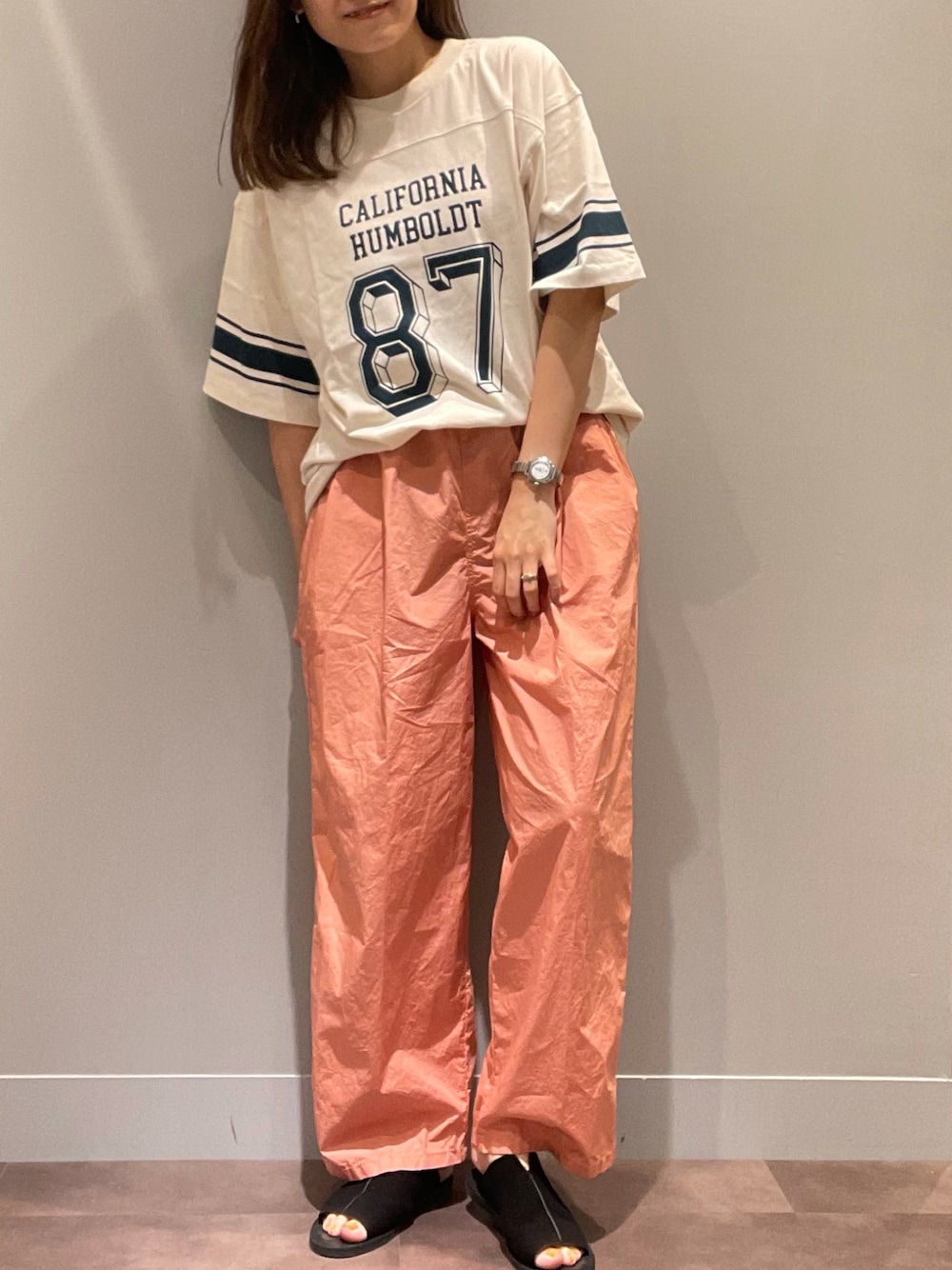 サーモンピンクみたいなオレンジが可愛いカラーパンツ◎ ロゴTと合わせるだけで完成する♪