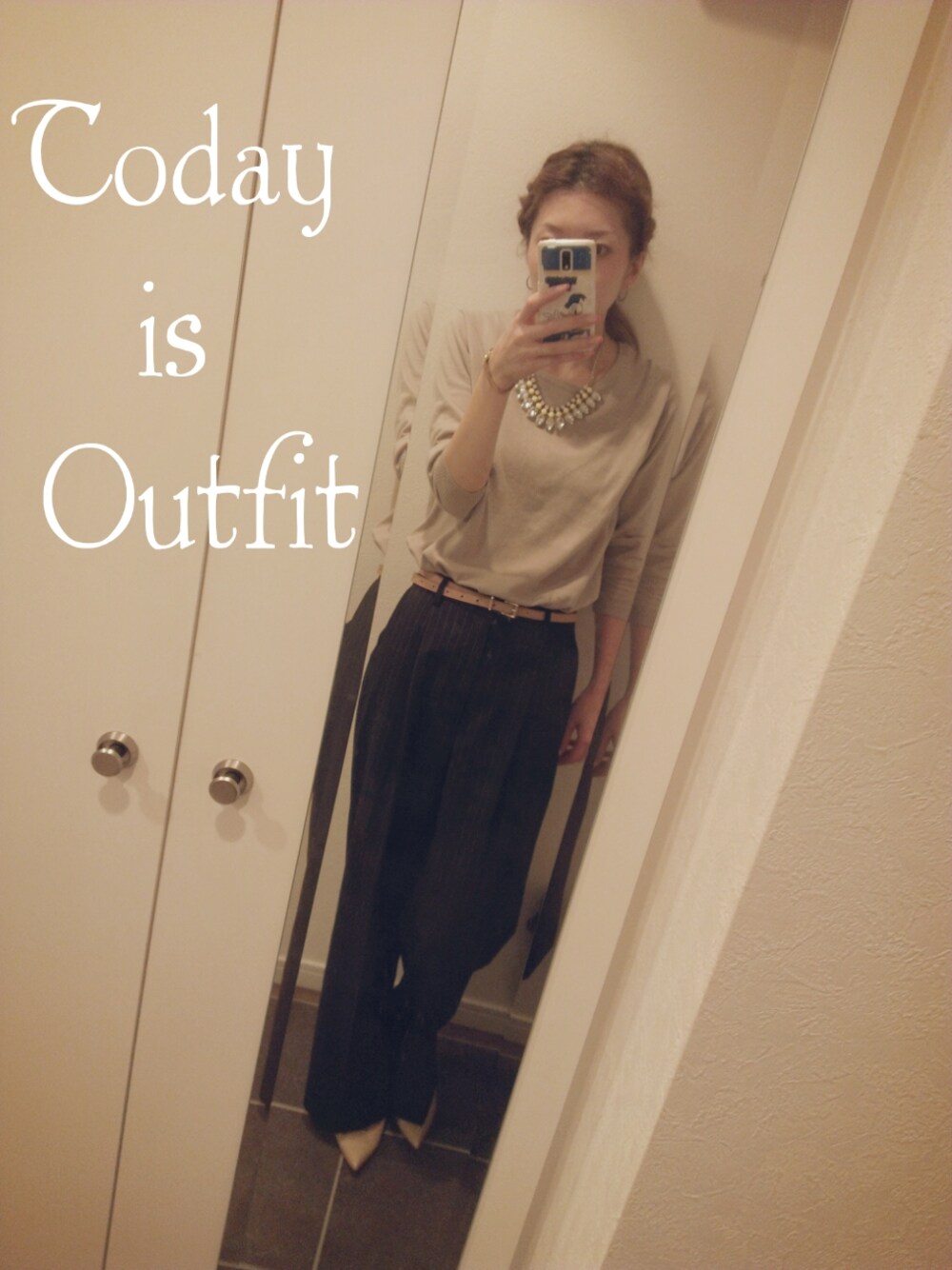 ストライプのワイドパンツ!! 狙ってたやつ!めちゃ可愛い。 買ったその日に自転車に巻き込みました。。。 あーショック。。。 秋はこのパンツにロゴニット合わせたい♪ この日は仕事だったので、オフィスカジュアル合わせになりました。