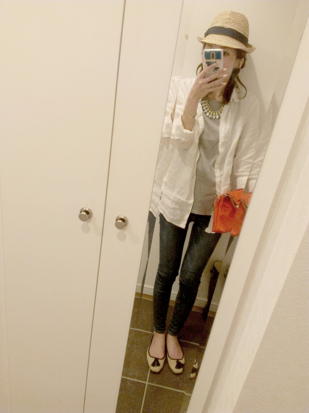 旦那さんから拝借して、men'sシャツを羽織り代わりに。 結構使えるんです! 運動会にいるお母さんみたいって言われましたけどね。。。。 リネンシャツ、肌触りいいし好き。 デニム▼ディーホリック 靴▼アダムエロペ