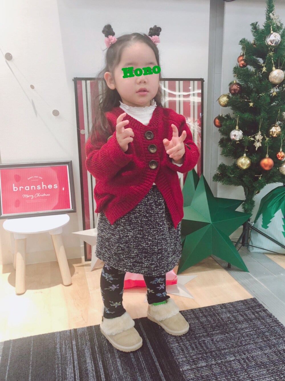 全身ブランシェスコーデ💓 おためしブランシェスに参加してみた🤗 全部、今年購入‼️💕 クリスマスコーデ😊✨ *サイズ ロンT 110cm カーディガン Sサイズ(95-105cm) ショートパンツ 100cm レギンス 105cm ムートンブーツ 15cm