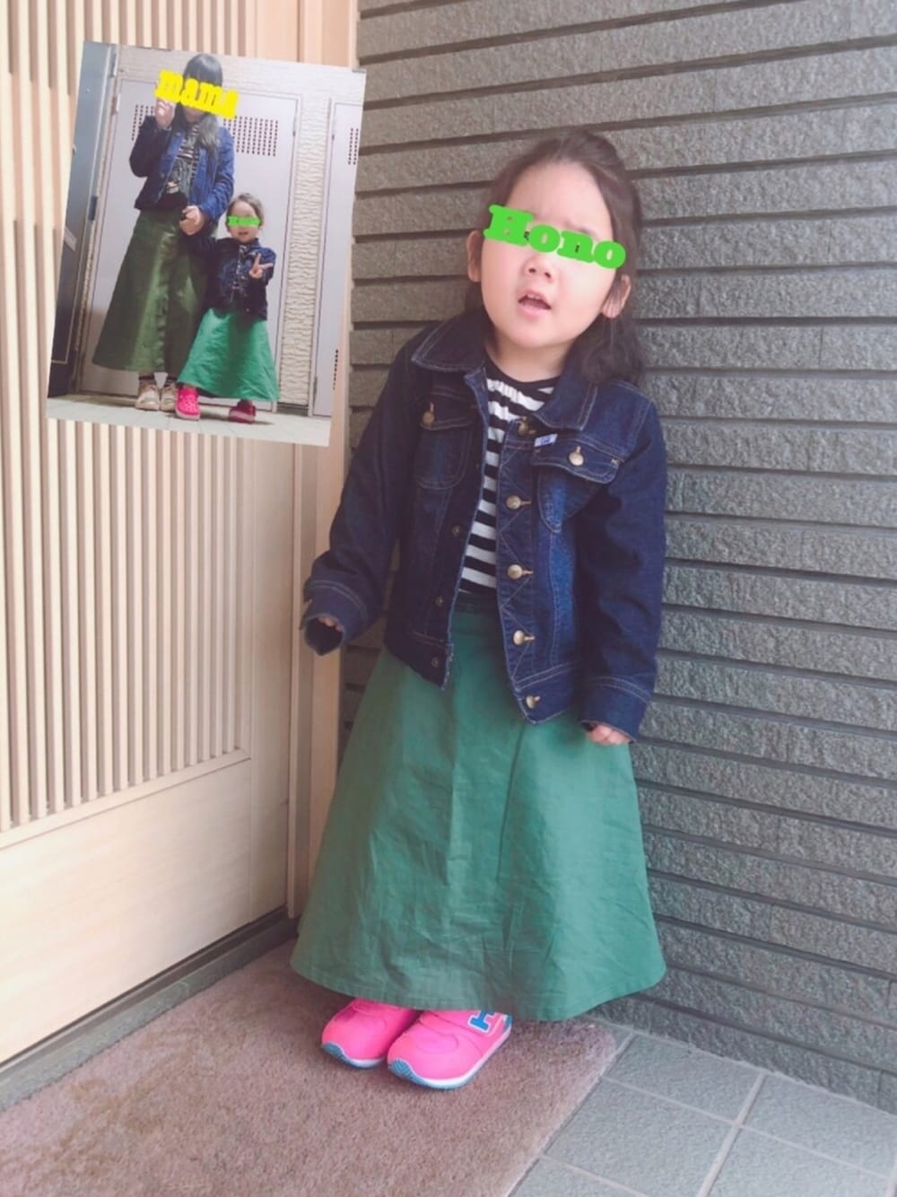 リンクコーデ💕 ボーダー×緑スカート×デニム🤗 *サイズ トップス 95cm スカート 100cm デニムジャケット 100cm 靴下 13-15cm スニーカー 16cm