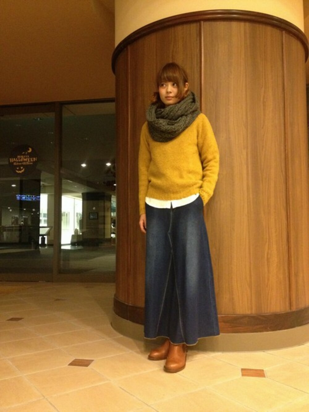 マキシ丈のデニムスカートをつかったシンプル、コーディネート!