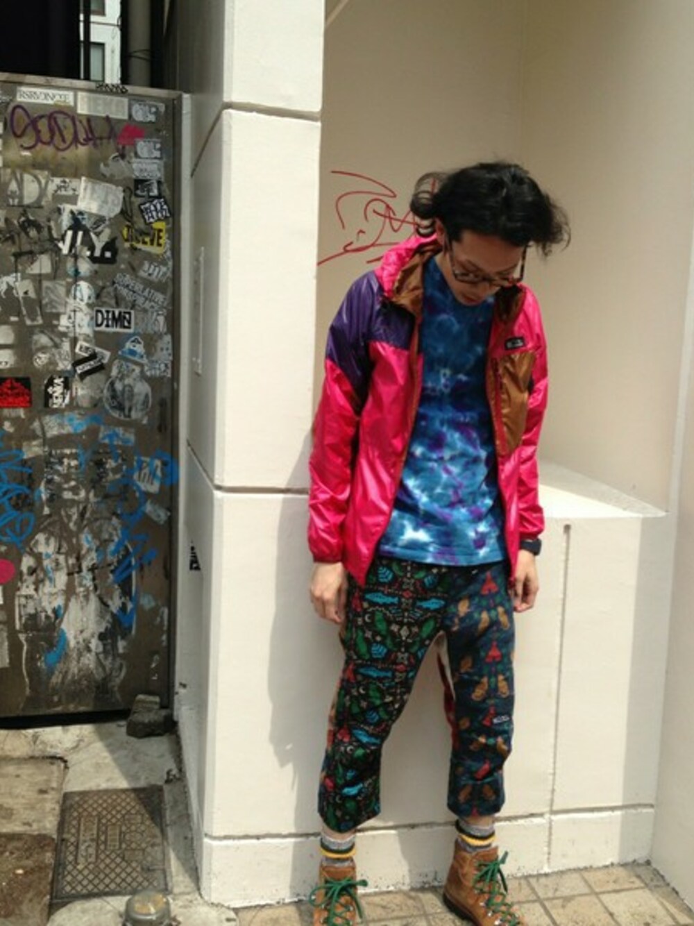 街でもアウトドアアイテムをかっこよく! 柄×柄にナイロンパーカーで、すっきりとしたスタイルに。