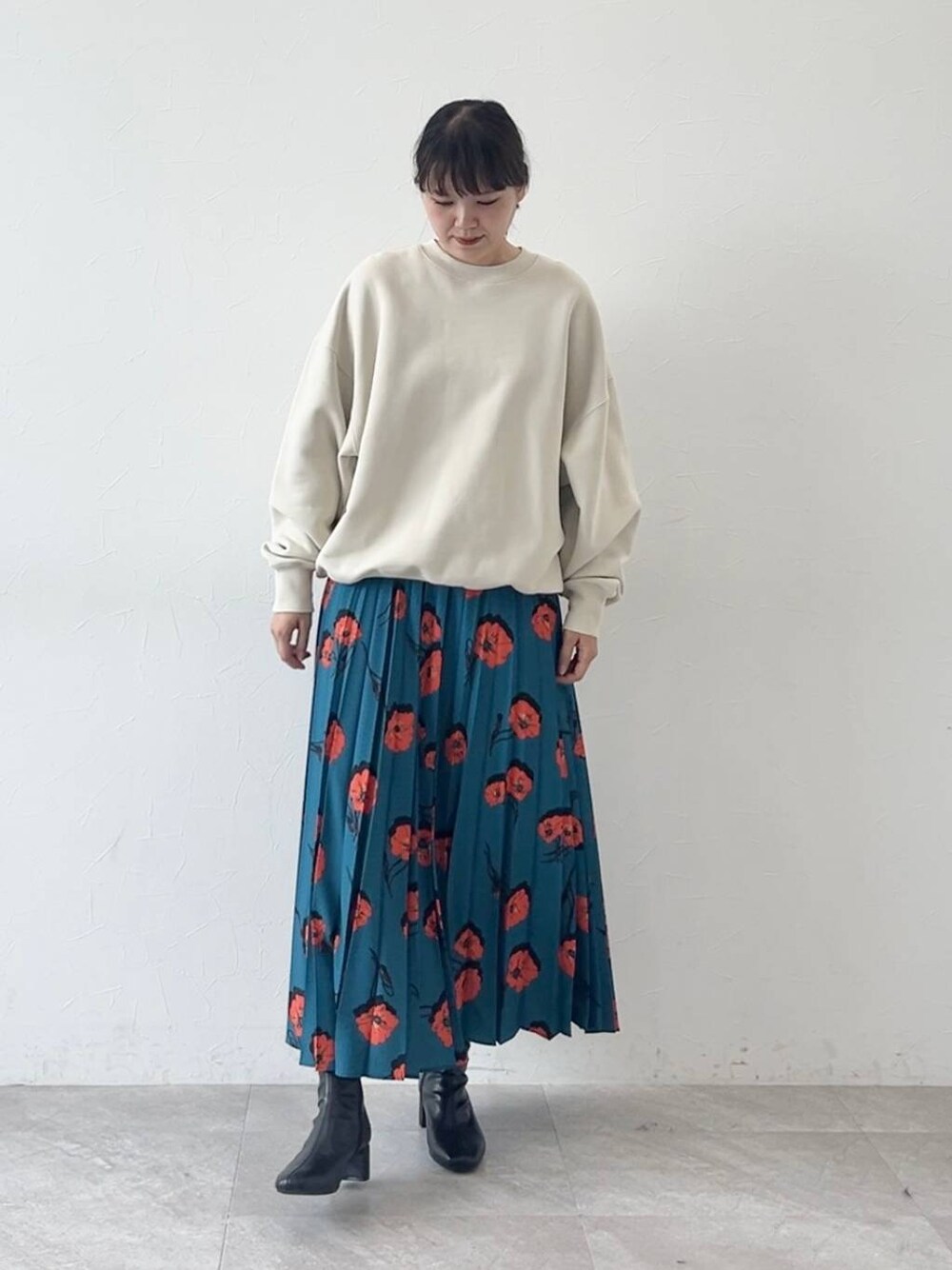 スウェットはお尻が隠れる丈感なので 体型カバーにもなります! スカートはウエストゴムなので、 とて楽ちんにはけて、綺麗にプリーツが出るデザインです!