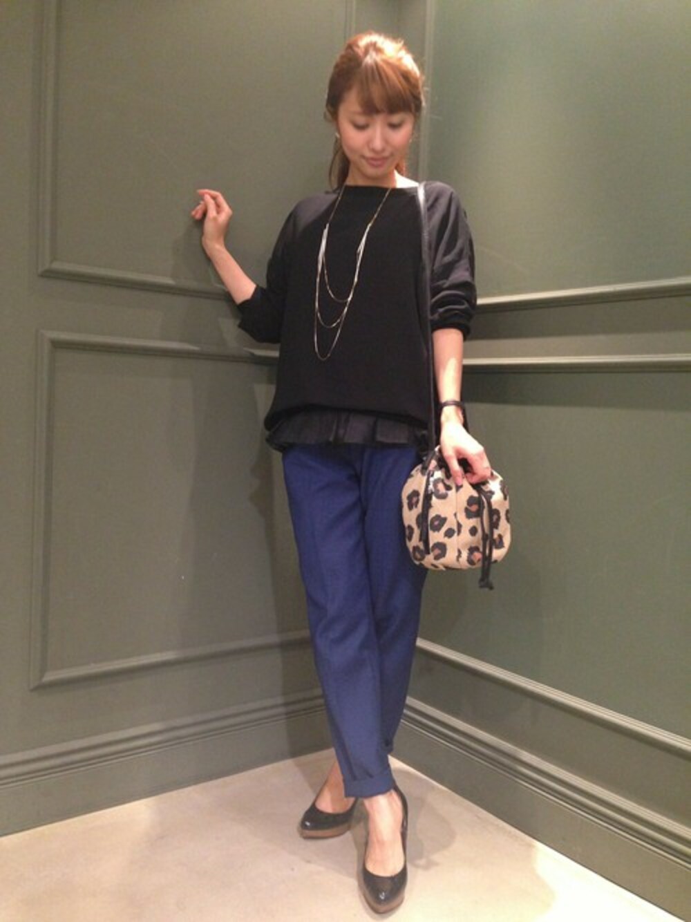 暗いカラーのトップスですが素材で軽さを出しました。重ねて着ているペプラムインナーは、お手持ちのトップスを大人可愛く仕上げてくれるのでとてもオススメの一枚です!