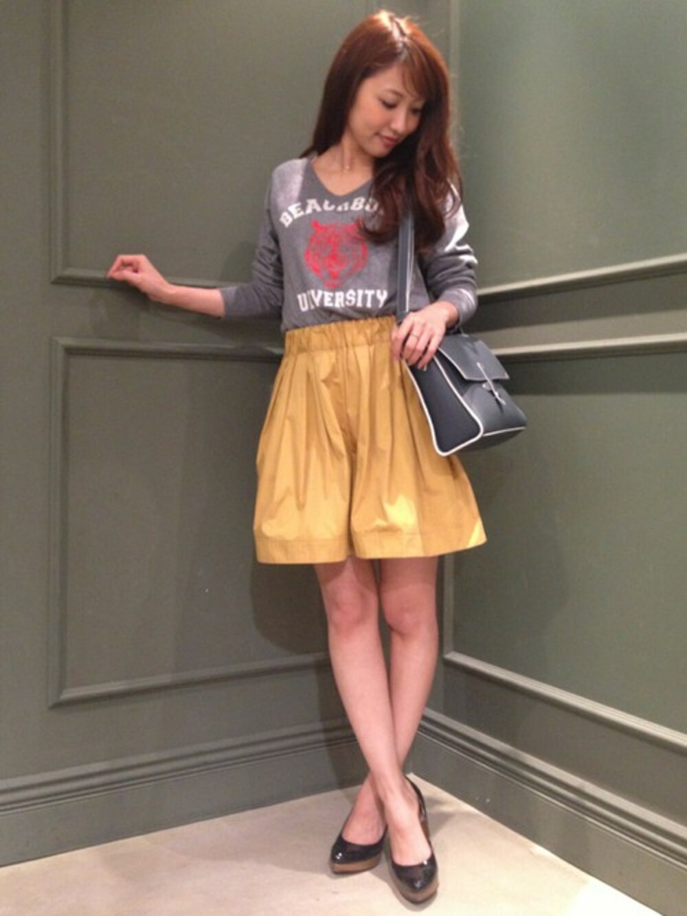 春らしいカラーとふんわりした形がかわいいキュロットです。リバーシブルなので使い回しがきくのが嬉しいですね!プリントニットでカジュアルめにしてみました。