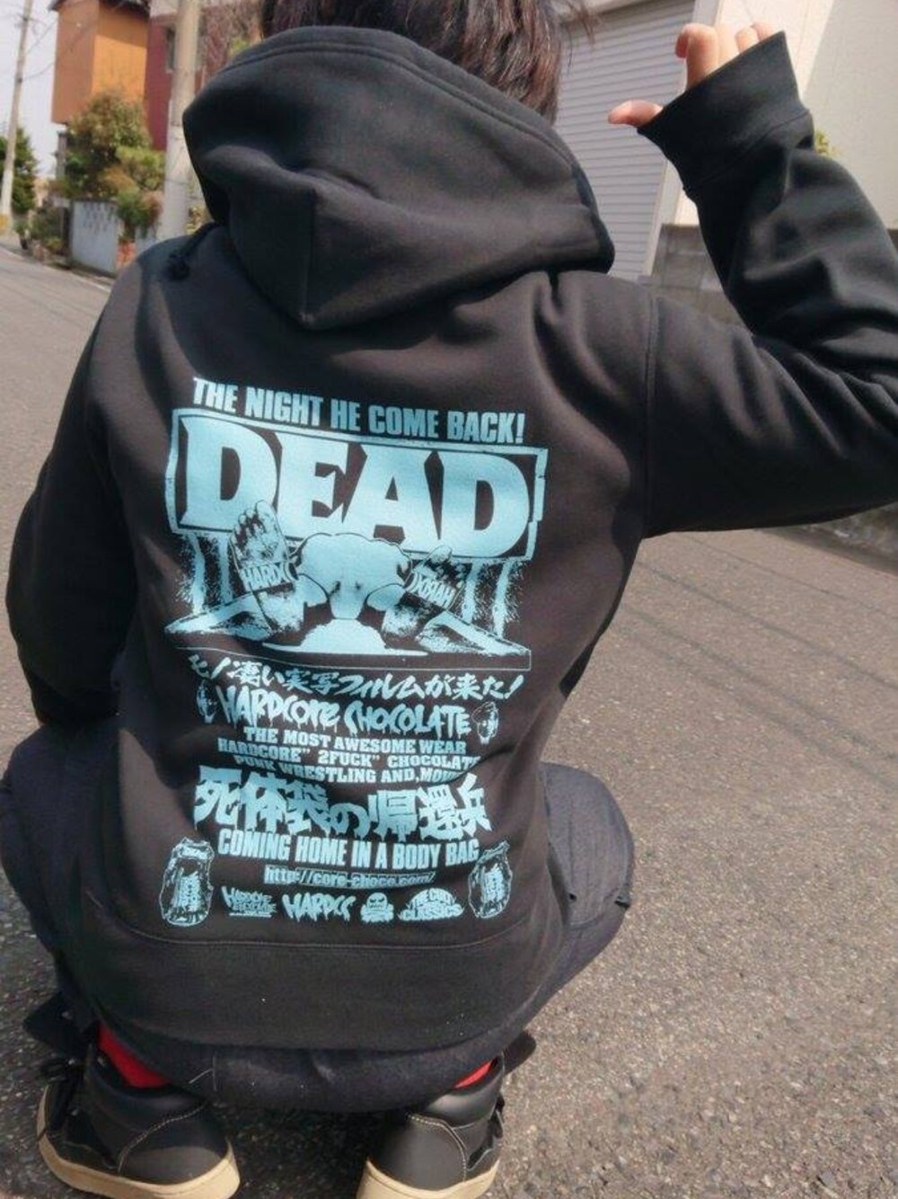 ハードコアチョコレートのパーカー「コアチョコ 死体袋の帰還兵 ZIPパーカ(遺体ブラック)」を使ったコーディネート