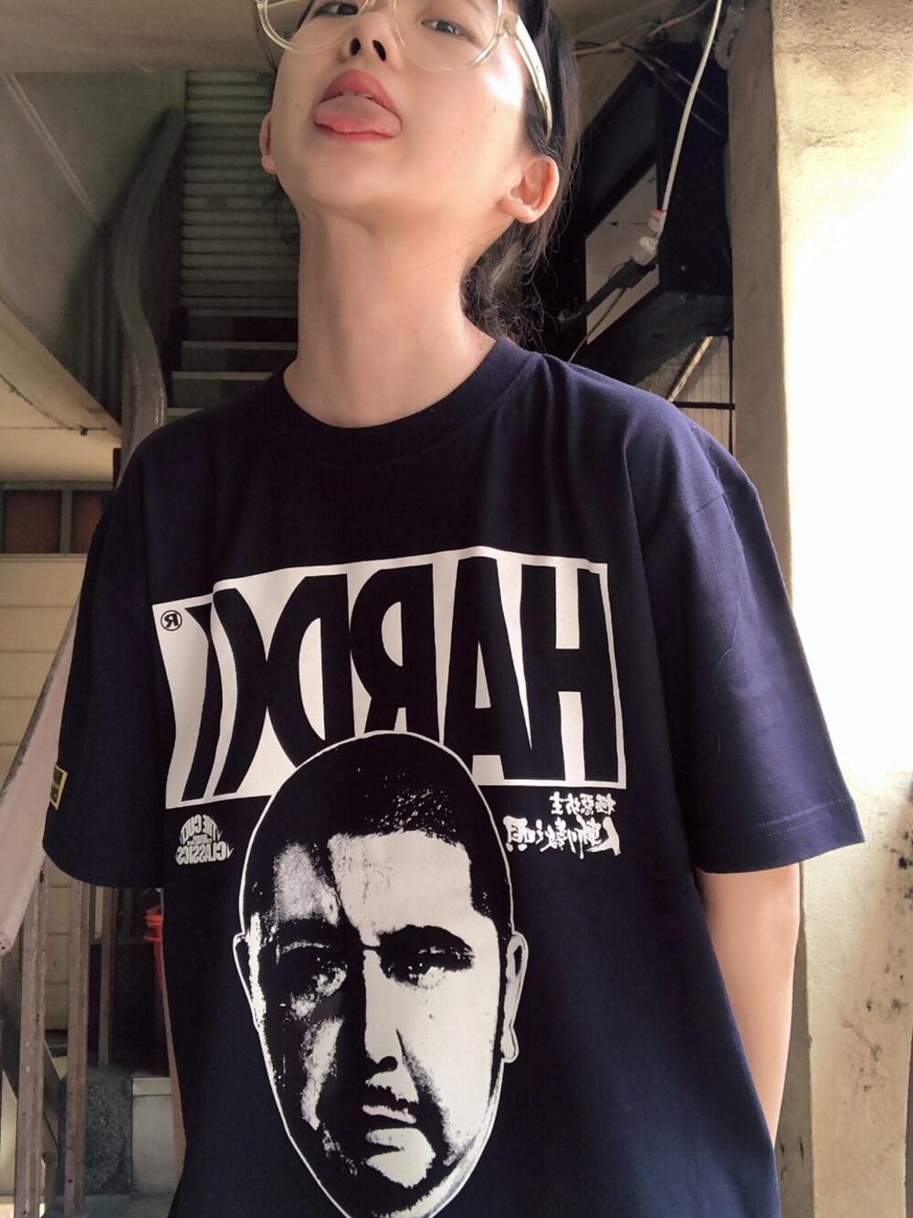 ハードコアチョコレートのTシャツ/カットソー「若山富三郎「極悪坊主 人斬り数え唄」(南無阿弥陀仏ネイビー)」を使ったコーディネート
