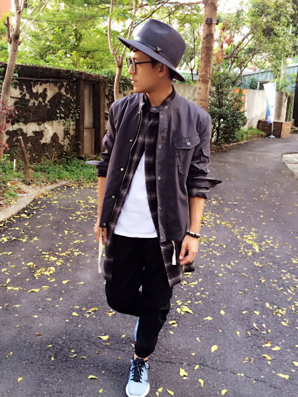 短版帥氣騎士風外套' 與長板格襯、素T的完美三件式組合' 百搭窄版慢跑褲、紳士帽' 獨特混搭的的層次感!!