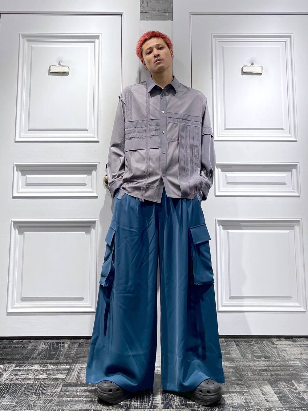 ◉シャツ◉ スウェードライクなシャツにレース生地をつなげ合わせたデザインシャツ!!🔥一枚着でもお洒落に着れますが、着丈が長めなので、アウターやカーディガンなどの羽織りをレイヤードしても裾のデザインを魅せることができます!!✨ ◉パンツ◉ DABOにカーゴパンツ登場!!裾のドローコードでシルエットを変えられる!!でも絞っていない状態でもシルエットがエグいきれいに出ます!オールシーズン使える生地感!!