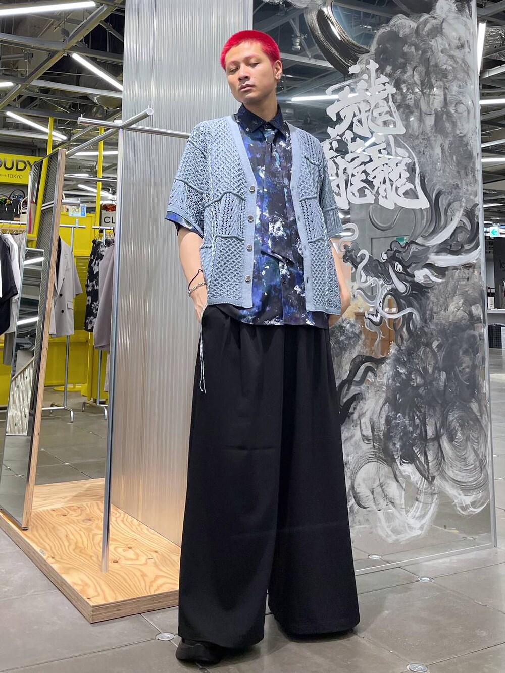 ◉カーディガン◉ 春夏でも過ごしやすい透かし編みカーディガン!模様の異なるニットを切り替えているので、少し個性的なアイテム!インナーはTシャツでもノースリーブでもシャツでも合わせやすい! ◉シャツ◉ モードなアブストラクト柄が特徴のシャツ!!ボウタイがセットになっていて、マルチに着回せるデザイン!!👍🏻シワになりにくく、夏でも過ごしやすいポリエステル生地✨ ◉パンツ◉ 超極太パンツ!!テロテロで落ち感のある生地で着心地も最高!!裾に向かって広がるAラインのシルエットが出るようになっていて、どの角度から見ても形えぐい🔥モードなスタイリングにピッタリ!!