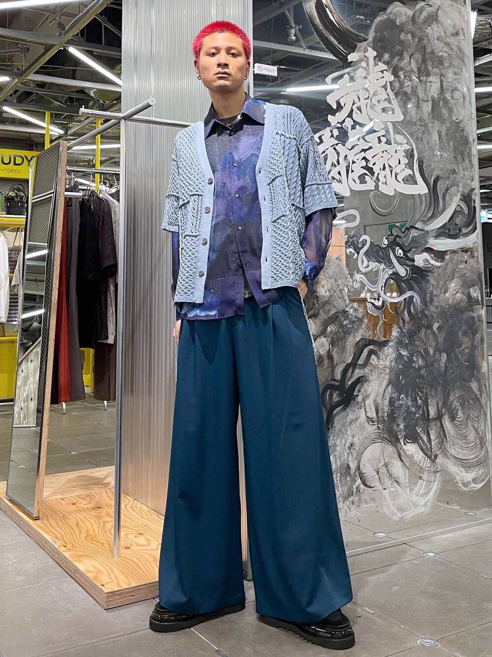 ◉カーディガン◉ 春夏でも過ごしやすい透かし編みカーディガン!模様の異なるニットを切り替えているので、少し個性的なアイテム!インナーはTシャツでもノースリーブでもシャツでも合わせやすい! ◉シャツ◉ 春から夏にかけて長いシーズンで着れちゃうシアーシャツ!!インナーを長袖〜半袖〜ノースリーブに変える事でいろんなシーズンに対応させて着用できます!グラフィックもHAREらしいモードなフラワーで雰囲気バチバチ🖤 ◉パンツ◉ 超極太パンツ!!テロテロで落ち感のある生地で着心地も最高!!裾に向かって広がるAラインのシルエットが出るようになっていて、どの角度から見ても形えぐい🔥モードなスタイリングにピッタリ!!