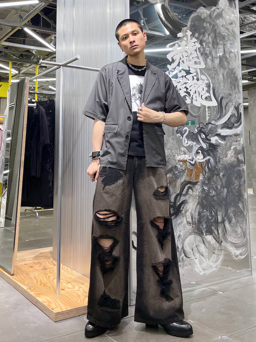 ◉ジャケット◉ きれいめなショートスリーブジャケットですが、カットオフデザインでやや武骨で渋みの出る一着!❤️🔥インナーはシャツもおすすめですが、タンクトップやTシャツでラフにスタイリングするのがおすすめ✨ ◉カットソー◉ プリントカットソーが結局一番使いやすい!一枚着でも、インナーとして使っても、個性的なハクプリントを魅せたスタイリングが叶う!!💪🏻ややコンパクトなサイズ感でスタイリッシュな雰囲気に!!✨ ◉パンツ◉ ゴテゴテグランジなデニムパンツ!!ややフレアなシルエットがHAREっぽさも出てる!!Tシャツ一枚着合わせやシャツ羽織りのラフな合わせがおすすめ!!