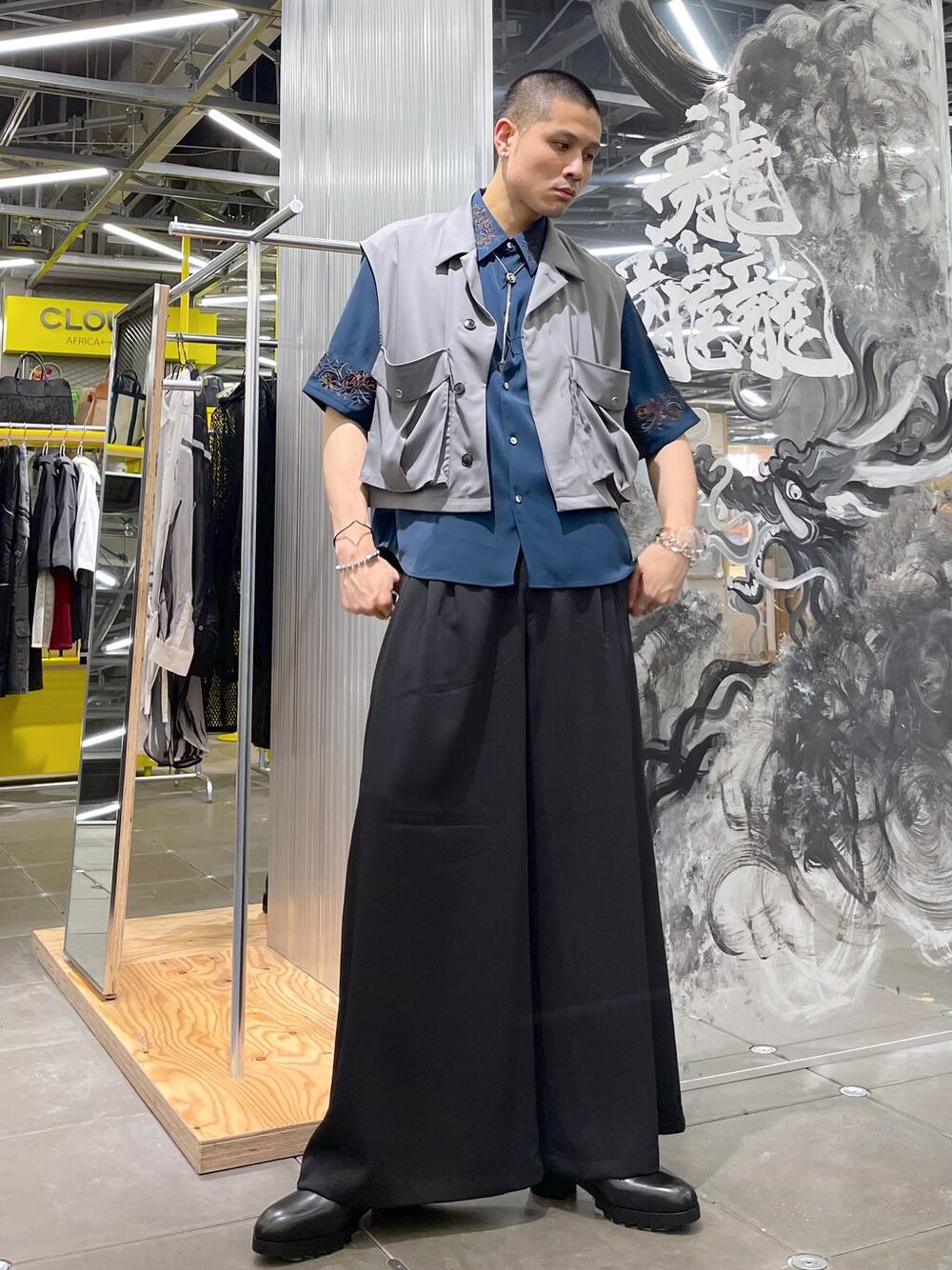 ◉ベスト◉ トレンドシルエットのショート丈ベスト!ジャケットのような襟になっているのでインナーにはシャツでもTシャツでも何でも合わせやすい!短丈なのでボリューム感のあるボトムスで合わせるのがおすすめ!!🔥 ◉シャツ◉ TOROMIシャツの刺繍入りバージョン!安定の涼しい、すぐ乾く、シワになりにくい、最高のシャツ!袖と襟に刺繍が入っているので、インナーに使っても個性を潰さずにオシャレにレイヤードできます!✨ ◉パンツ◉ 超極太パンツ!!テロテロで落ち感のある生地で着心地も最高!!裾に向かって広がるAラインのシルエットが出るようになっていて、どの角度から見ても形えぐい🔥モードなスタイリングにピッタリ!!