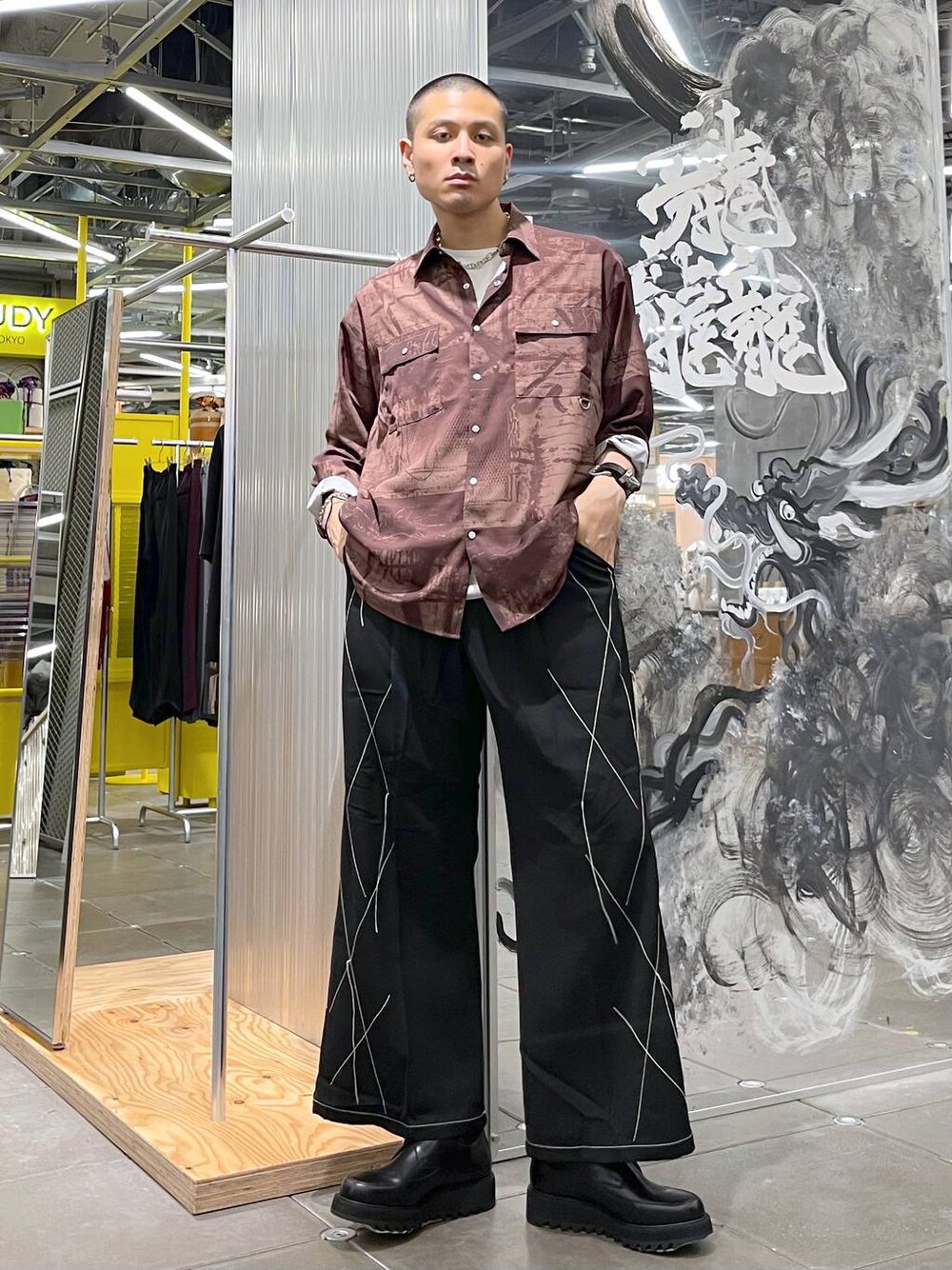 ◉シャツ◉ ウォールアートを抽象的柄に落とし込んだデザインシャツ!!長袖ですが、とても薄手で晩夏から使えそうな素材感!!シルバーのスナップボタン、胸元にポケットをつけ、少しミリタリーな雰囲気も! ◉パンツ◉ 落ち感のあるポリエステル素材で夏でも過ごしやすい!!シンプルなボトムスばかり買ってしまうという悩みはこれで解決!!派手すぎないデザインで、様々なトップと合わせやすい!!