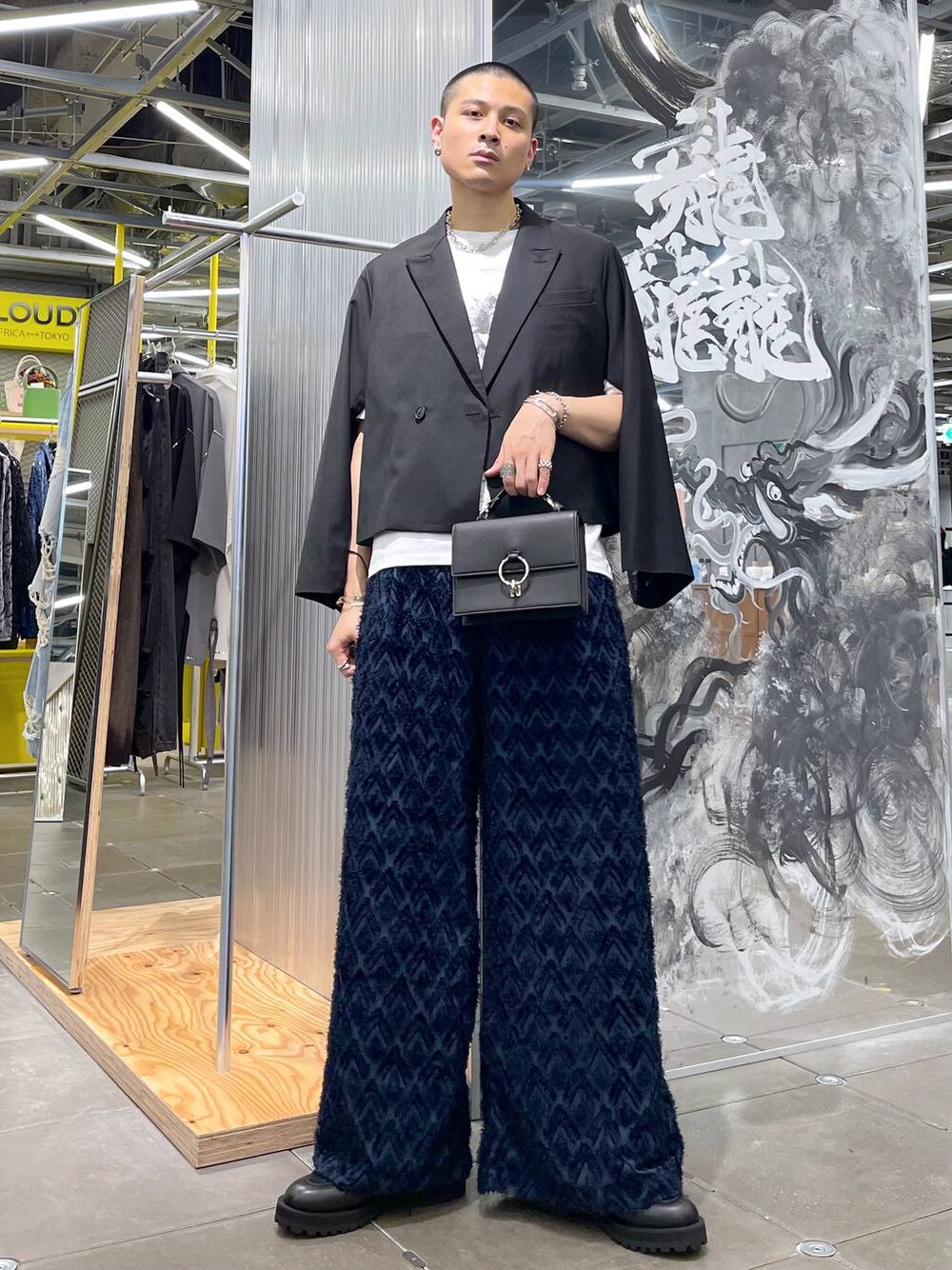 ◉ジャケット◉ 袖のファスナーで個性的な着方ができるテーラードジャケット!!インナーには、柄トップスや袖にデザインが入っているアイテムを入れるとよりオシャレに合わせられる🫡かつ、メンズには珍しいショート丈で、中性的なスタイリングも可能!!❤️🔥 ◉カットソー◉ プリントカットソーが結局一番使いやすい!一枚着でも、インナーとして使っても、個性的なハクプリントを魅せたスタイリングが叶う!!💪🏻ややコンパクトなサイズ感でスタイリッシュな雰囲気に!!✨ ◉パンツ◉ 極太かつフリンジデザインで差別化!!シアー素材を使っていますが、裏地が付いているのでご安心を!!トレンドのワイトシルエットで存在感抜群!!🔥