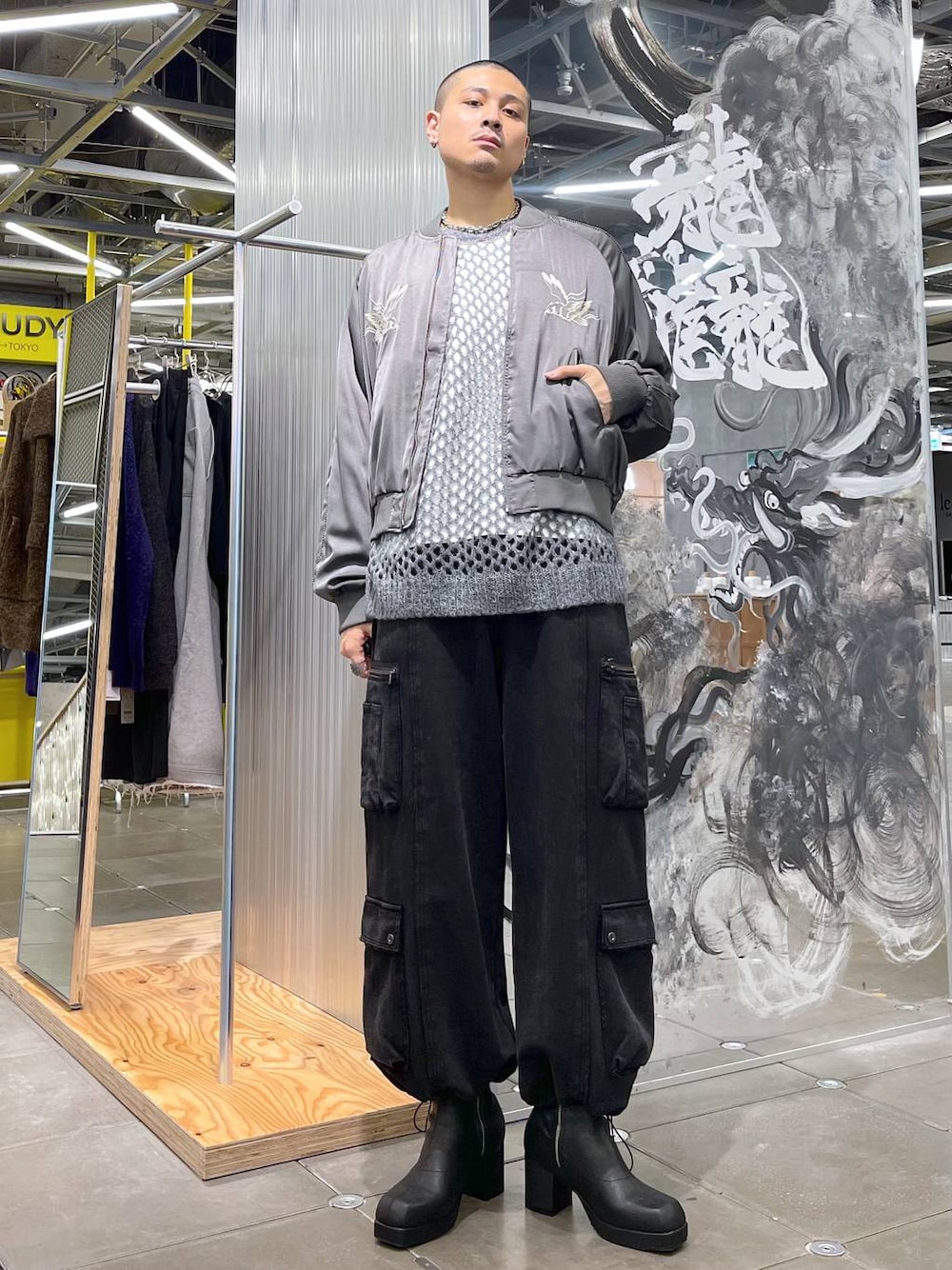 ◉ブルゾン◉ アメカジ、カジュアル、きれいめの外しにまで様々なスタイリングにピッタリのブルゾン!!光沢感のある生地と見頃の刺繍が高見え間違い無し!!!✨ ◉ニット◉ トレンドのメッシュニット!毛足が長いモヘアニットなので季節感が出せる!インナーをタンクトップ〜ロンTなど調節する事で暑い季節から使いやすいトップスです!! ◉パンツ◉ ピグメント加工のハードな見た目に反して柔らかいスウェット生地でストレスフリー!ウエストがゴムでドローコードが付いているので、楽に履ける仕様!裾を絞ることでシルエットに変化をつけることもできます!!