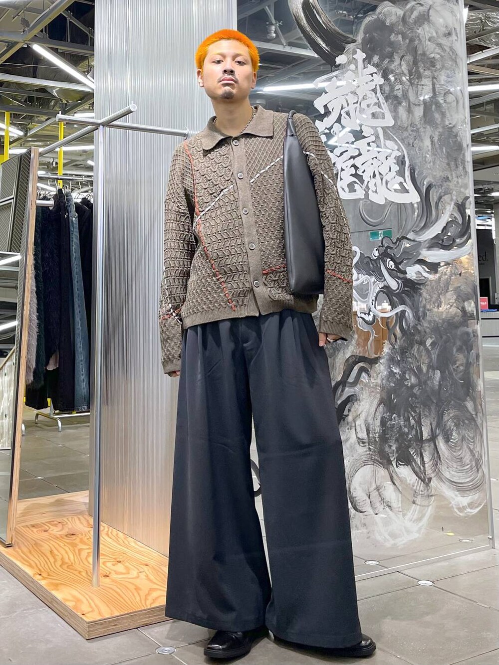◉カーディガン◉ 個性的なシャツ型ニットカーディガン!Vネックのカーディガンとは違い一枚着でも成立する利便性🙆🏻♂️ステッチデザインが派手過ぎなくて、使いやすい!!編み方の異なるニットを組み合わせていて、それもこれも周りと差別化できるポイント!! ◉パンツ◉ 超極太パンツ!!テロテロで落ち感のある生地で着心地も最高!!シルバーはシャカシャカでくっきりシルエットが出る素材感!裾に向かって広がるAラインのシルエットが出るようになっていて、どの角度から見ても形えぐい🔥モードなスタイリングにピッタリ!!