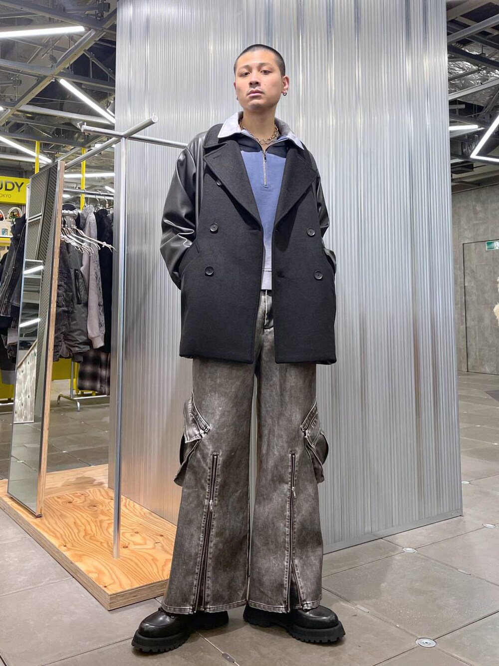 ◉コート◉ 09・78カラーはフェイクレザーとウール混生地の切り替えデザインが映えるシックに決まる!切り替えのおかげで「大人っぽさ>ハード」でフェイクレザーを取り入れることができます!逆にカジュアルにPコートを着たい方にはカモフラのような柄の00カラーもおすすめ!! ◉スウェット◉ グラデーションにブリーチされた個性的なハーフジップスウェット!リメイクアイテムのような切り替えデザインが映える!!一枚着で様になるので、楽におしゃれが楽しめる!! ◉パンツ◉ ジップとベルトが個性的なカーゴパンツ!モードできれいめなフェイクレザー(08)とTR素材(09)でHAREらしさ全開!!黒系で合わせやすい上に他のボトムスと差別化しやすいからマンネリ感じてるならコレ!!