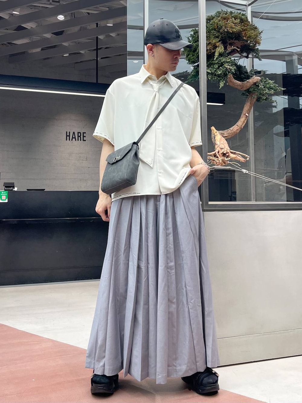 ◉シャツ◉ ボウタイがセットになったマルチウェイできちゃうデザインシャツ!!シルバーパーツがいいアクセントになる!派手すぎないから春夏の一枚着スタイルにちょうど良い!!トゥルントゥルンな生地がHAREっぽい!! ◉パンツ◉ HAREの大人気シリーズ「YOSE」!!和モードなプリーツデザインがたまらない!!袴のようなディテールでシンプルになりやすい春夏のスタイリングにアクセントをつけてくれる!🔥かつデザインだけではなく、ワイドなので通気性もよく意外と快適!!✨