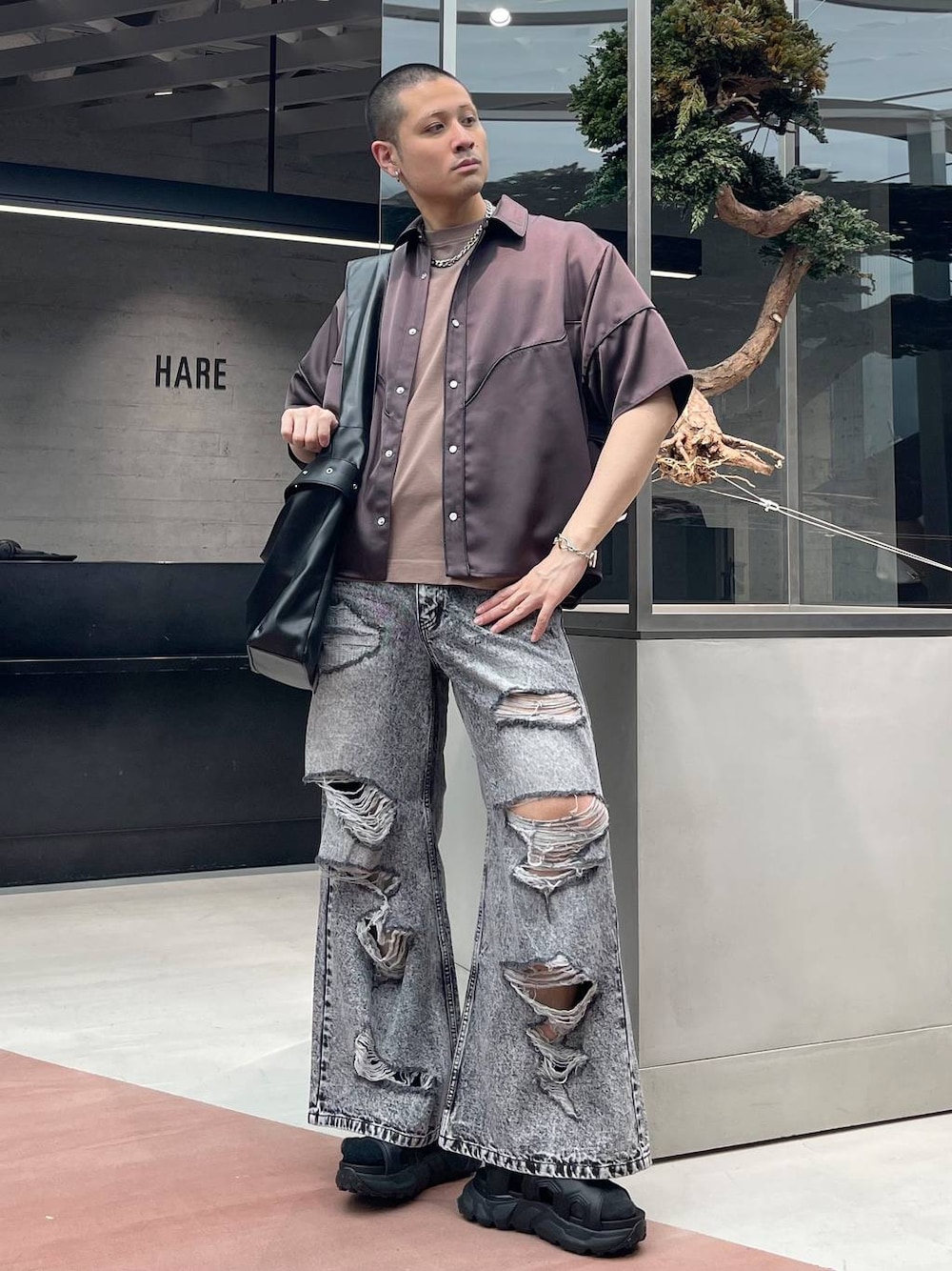 ◉シャツ◉ ウエスタンシャツをモードに昇華させたデザインシャツ!!サテンのような広沢のある素材で雰囲気が出て、サラッと着心地も良い!!レザーのパイピングがモードなアクセントをつけてくれます!! ◉カットソー◉ ミニマムなフラワー刺繍が程よくアクセントになってくれる!!一枚着はもちろん、シャツやカーディガンの無地インナーとしても代用できる汎用性!! ◉パンツ◉ ゴテゴテグランジなデニムパンツ!!ややフレアなシルエットがHAREっぽさも出てる!!Tシャツ一枚着合わせやシャツ羽織りのラフな合わせがおすすめ!!