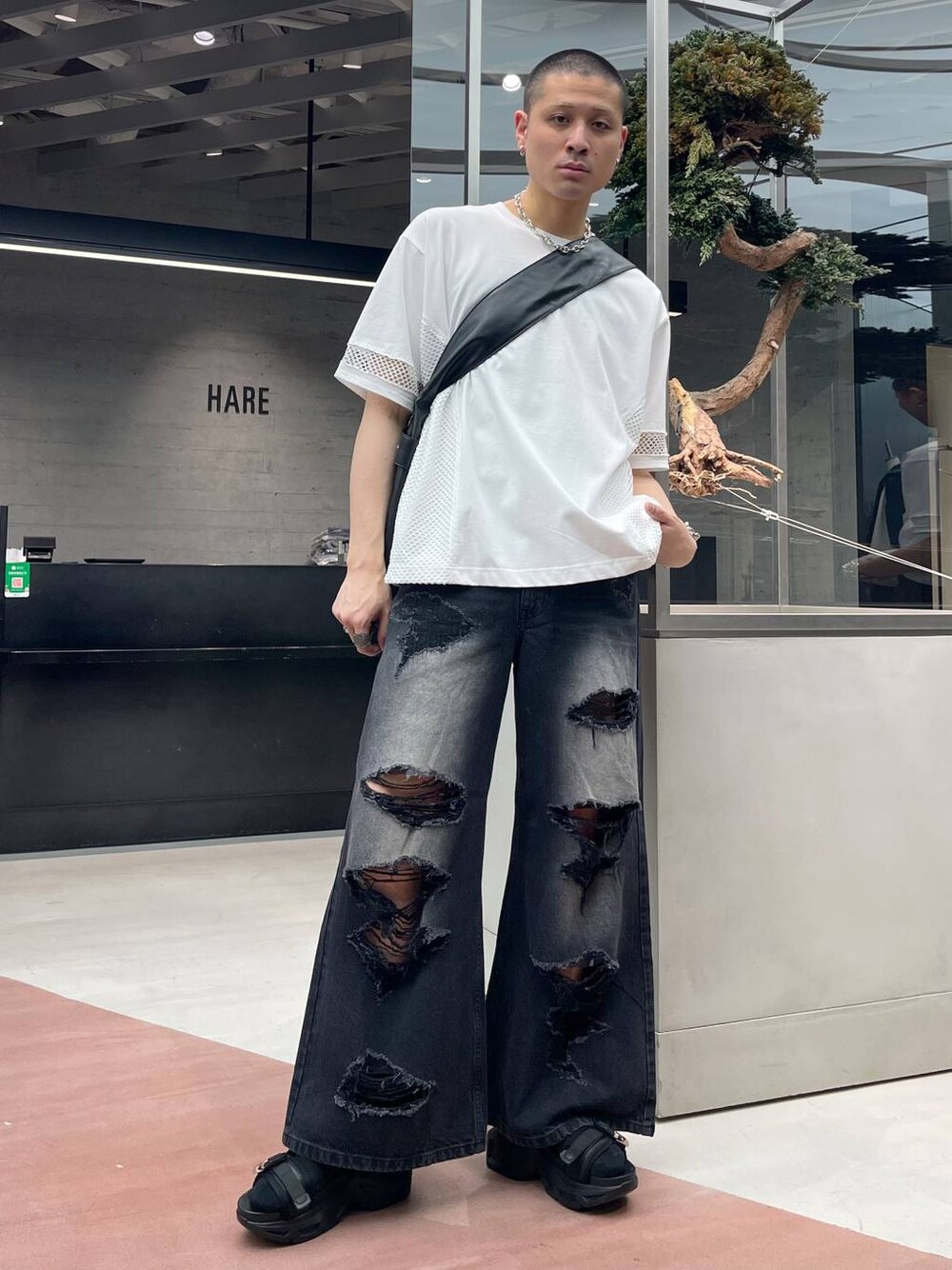 ◉カットソー◉ 切り替えデザインでメッシュ素材が使われた個性派カットソー!インナーを考えず簡単にトレンドのメッシュを取り入れられるのはありがたい!👍🏻一枚着でサマになるので盛夏にピッタリです! ◉パンツ◉ ゴテゴテグランジなデニムパンツ!!ややフレアなシルエットがHAREっぽさも出てる!!Tシャツ一枚着合わせやシャツ羽織りのラフな合わせがおすすめ!!