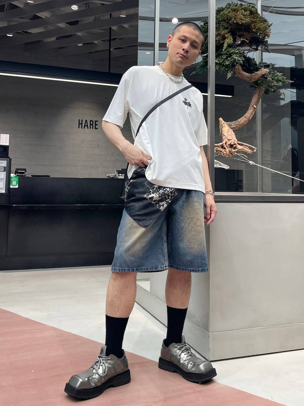 ◉カットソー◉ HAREタグをワンポイントでつけた今までになかった個性的なデザイン!!一枚着でも使いやすいデザイン性とシャツやアウターのインナーにも使いやすい厚すぎない生地感で汎用性も🙆🏻接触冷感素材でひんやり〜❄️ ◉パンツ◉ 夏のカジュアルスタイルにピッタリなデニムショーツ!子供っぽく見えすぎないように渋いヴィンテージ加工がしてあるので、Tシャツやシャツと合わせるだけで味が出る便利アイテムです!