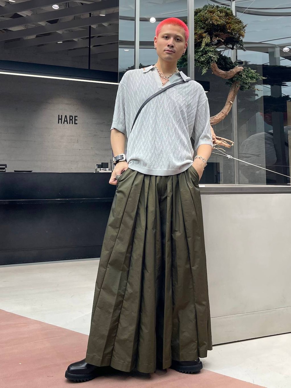 ◉ニット◉ スキッパーデザインのざっくり開いた襟が夏っぽい抜け感を出してくれる!独特な編み方が柄ほどうるさくないけど、程よく個性を放ってくれるから、一枚着でも🙆🏻♂️ ◉パンツ◉ HAREの大人気シリーズ「YOSE」!!和モードなプリーツデザインがたまらない!!袴のようなディテールでシンプルになりやすい春夏のスタイリングにアクセントをつけてくれる!🔥かつデザインだけではなく、ワイドなので通気性もよく意外と快適!!✨