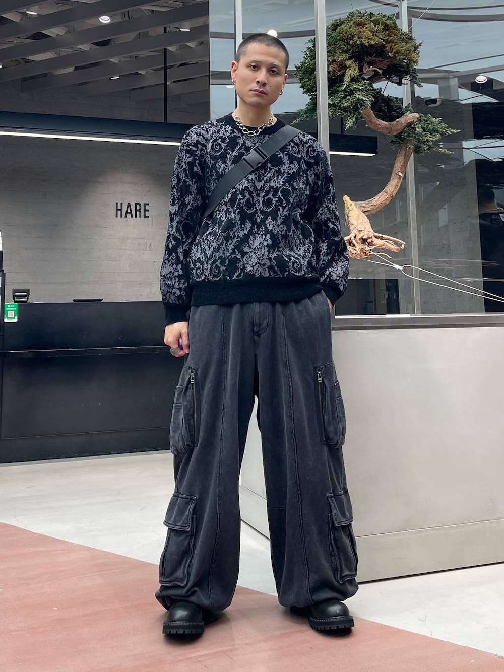◉ニット◉ HAREで毎シーズン大人気のモールニットプルオーバー!柔らかくチクチクしない、毛玉になりにくく手入れもしやすいニットです!✨ダマスク柄で大人っぽく、渋さのあるスタイリングに! ◉パンツ◉ ピグメント加工のハードな見た目に反して柔らかいスウェット生地でストレスフリー!ウエストがゴムでドローコードが付いているので、楽に履ける仕様!裾を絞ることでシルエットに変化をつけることもできます!!
