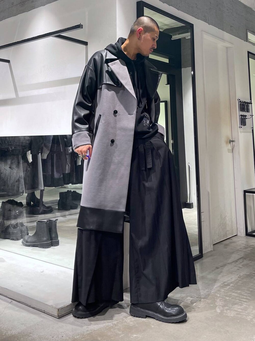 フーディーをモードスタイルに落とし込んだスタイル ◉ロングコート◉ 自社開発の「ウーリーテック」素材を使ったロングコート!!ウールのように温かいのに軽くて柔らかく、コスパ最強のロングコート!フェイクレザーとの切り替えでハード過ぎないシックかつ個性的な雰囲気で着用できます! ◉パーカー◉ フラワー刺繍、そしてポリエステル生地がモードスタイルにもぴったり。ダル着に見えないこのフーディーはカジュアルからきれいめ・モードにも対応可能。少しコンパクトなサイズ感もトレンディです。 ◉パンツ◉ HAREの大人気シリーズ「YOSE」!!和モードなプリーツデザインがたまらない!!袴のようなディテールでシンプルなスタイリングにアクセントをつけてくれる!🔥今回の新作は更に布をレイヤードさせたデザインでより洒落る!