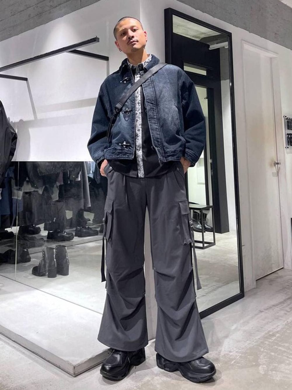 ◉ブルゾン◉ ファイヤーマンバックルがアクセントに!ヴィンテージライクな雰囲気がたまらない!ショート丈で脚長効果が抜群!真冬に使えるデニムブルゾンは少ないですが、中綿が薄く入っているのでこれからの時期に使えるブルゾンです! ◉シャツ◉ 使いやすいのが良い、ただシンプルには飽きた。そんな方にピッタリ。切り替えデザインだから、どんなアウターやボトムスとも合わせやすい。メタルボタンを使っているので、普通のシャツとも差別化可能。 ◉パンツ◉ レディースで大人気カーゴパンツにメンズバージョン登場!!🥹HAREでは定番のポリエステル素材がモードに決まる!!膝下のタックのおかげで、ウェーブ上に立体感あるシルエットが出るのも特徴です!!🔥