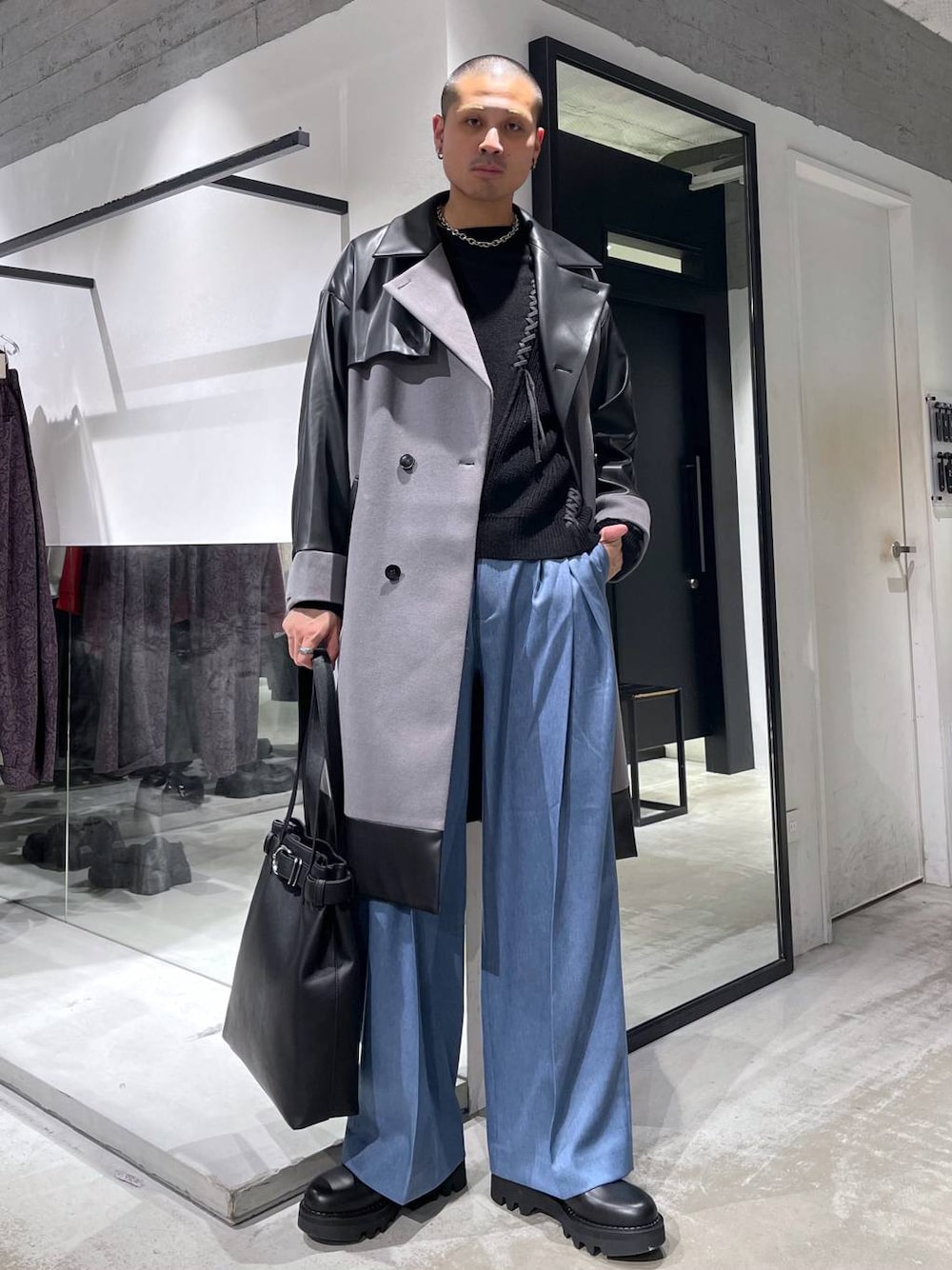◉ロングコート◉ 自社開発の「ウーリーテック」素材を使ったロングコート!!ウールのように温かいのに軽くて柔らかく、コスパ最強のロングコート!フェイクレザーとの切り替えでハード過ぎないシックかつ個性的な雰囲気で着用できます! ◉ニット◉ ステッチと切り替えデザインが特徴のニットプルオーバー!それぞれ異なる編み方の生地を切り替えているので、よ〜く見るとこだわりが見える!柄物ほど派手じゃないのに違いを生み出せるから、スタイリングに落とし込みやすい!! ◉パンツ◉ ウールのような肌触り・表面をポリエステルで再現した、シンプルかつ使いやすい王道スラックス。なんだかんだで着心地が良くないと着る気にならない。そんな方におすすめ!