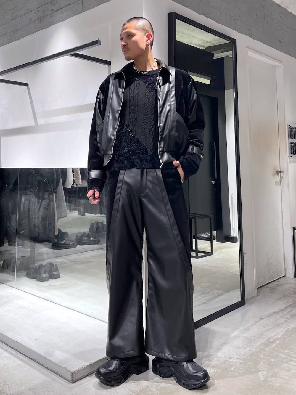 ◉ブルゾン◉ レザーブルゾンを改めてHAREというフィルターを通し、モードな切り替えデザインで昇華させたアイテム。3種類の生地を切り替える事で一着で奥行きのある仕上がり!セットアップでの着用もおすすめ! ◉ニット◉ 3種類のニットを切り替え、レザーコードもステッチのように施したデザインニット!ショート丈・少し長めなスリーブのトレンディなバランス感!ワイドパンツとの相性🙆🏻 ◉パンツ◉ 3種類の生地を切り替え・個性的なシルエットにこだわったカーブデザインで他と差別化!トップスがシンプルでも主役を張ってくれるようなアイテムです!