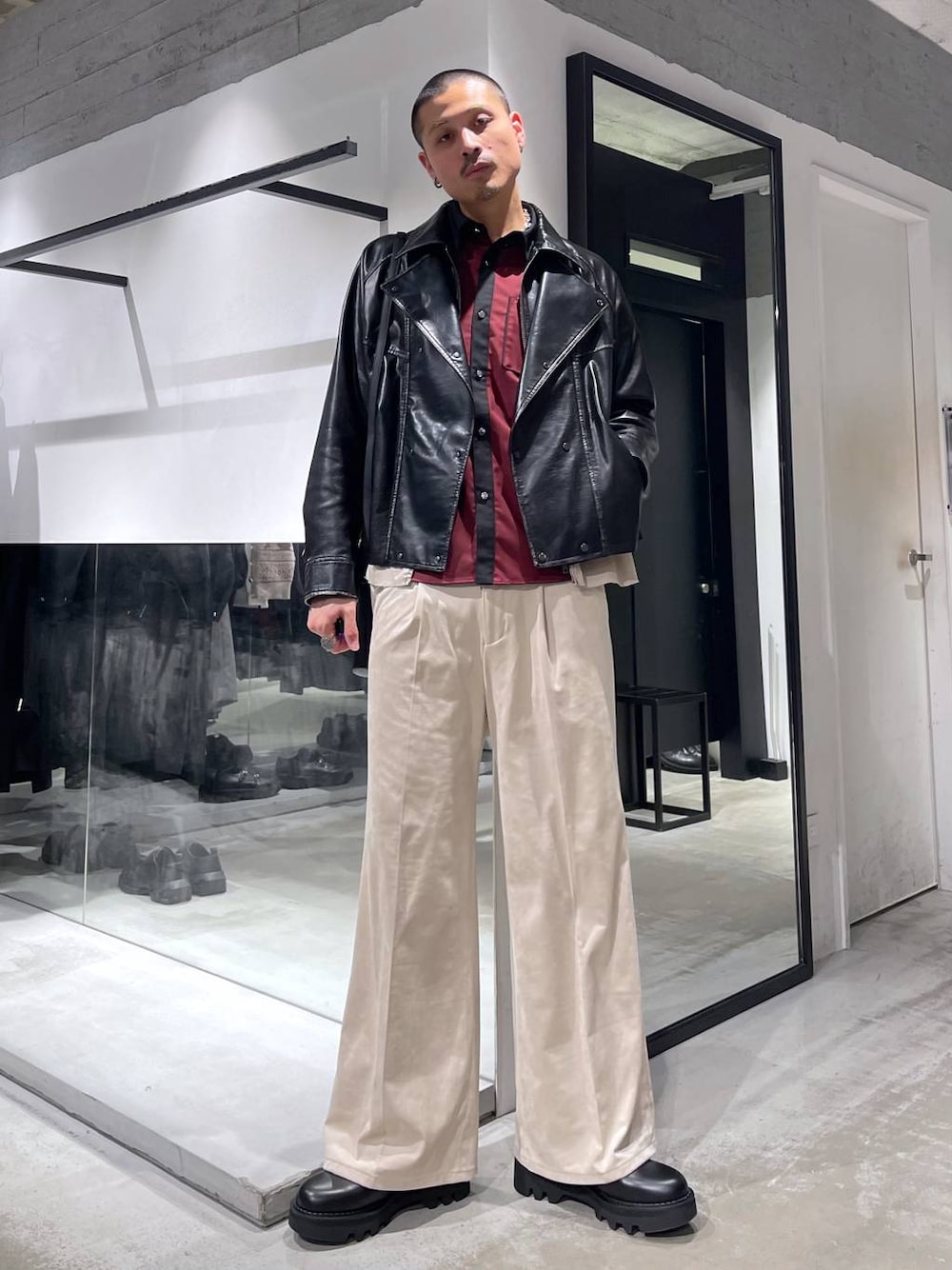 ◉ブルゾン◉ レイヤードデザインでモード・個性派に昇華させたフェイクレザーライダース!ヴィンテージライクな素材感にしているので古着系のスタイルにもピッタリ!ショート丈なのでスタイルアップが🙆🏻♂️ ◉シャツ◉ 使いやすいのが良い、ただシンプルには飽きた。そんな方にピッタリ。切り替えデザインだから、どんなアウターやボトムスとも合わせやすい。メタルボタンを使っているので、普通のシャツとも差別化可能。 ◉パンツ◉ 定番のレザーパンツ!!ややフレアのようなシルエットで美脚、脚長効果!!風を一切通さないのでお洒落なだけではなく、防寒性にも優れているので、一本以上は持っておくのをおすすめします!👍🏻