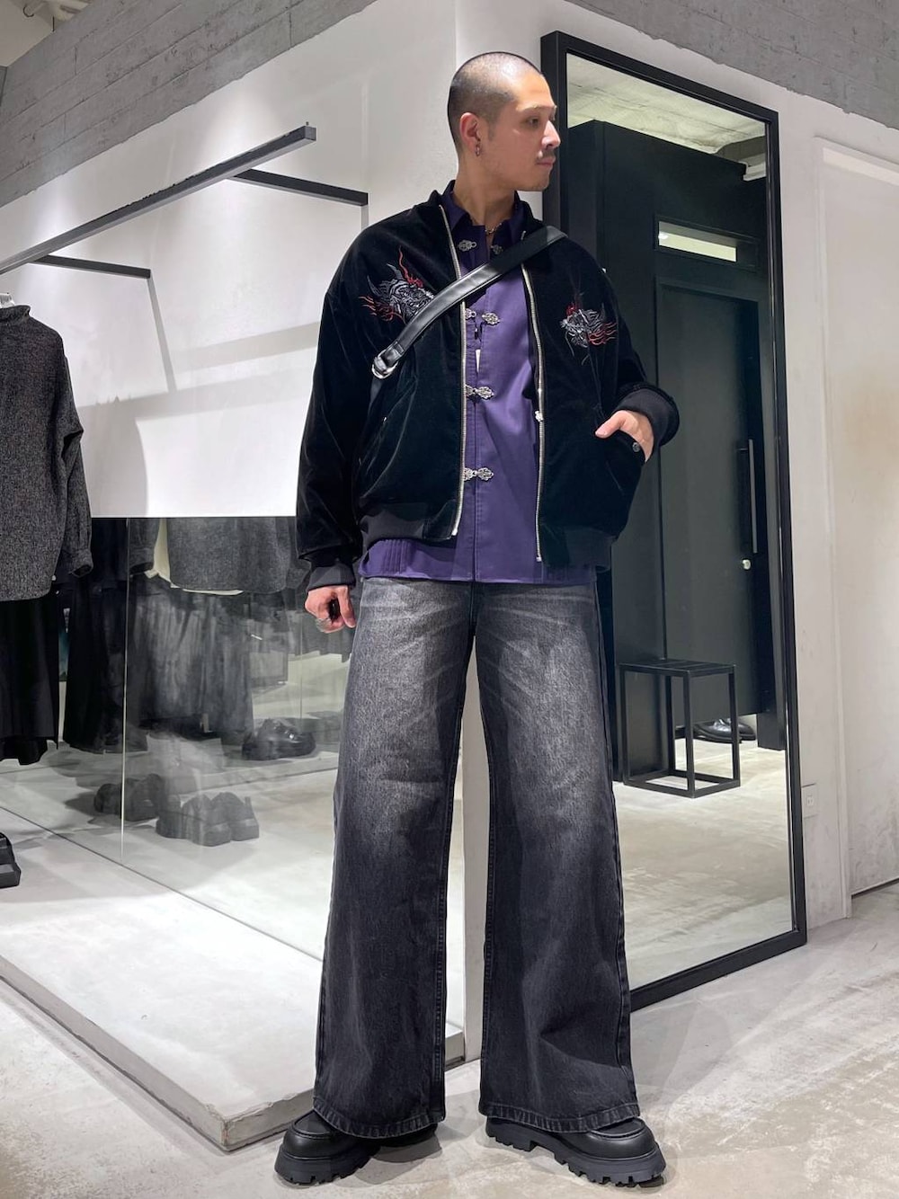 ◉ブルゾン◉ スーベニアブルゾンとMA-1をリバーシブルで使えるマルチウェイアウター!!どちらのカラーも刺繍が程よく派手過ぎない程度にアクセントになってくれるから、シンプルに飽きた方にもおすすめしたい一着! ◉シャツ◉ シンプルながらもメタルボタンがいい味出してくれるデザインシャツ!フックに引っかけるだけなので着脱が楽な上、アクセントになる!見頃にプリーツを施す事で一枚着でも様になってくれる! ◉パンツ◉ 個性的なカラバリデニムパンツ!!さらにヴィンテージのような色が抜けた加工がされていて、アクセントに!!通年で使えるアイテム!!フレアシルエットで脚長効果もあり🔥トップス次第で雰囲気もガラッと変わるので幅広いスタイリングがくめる!