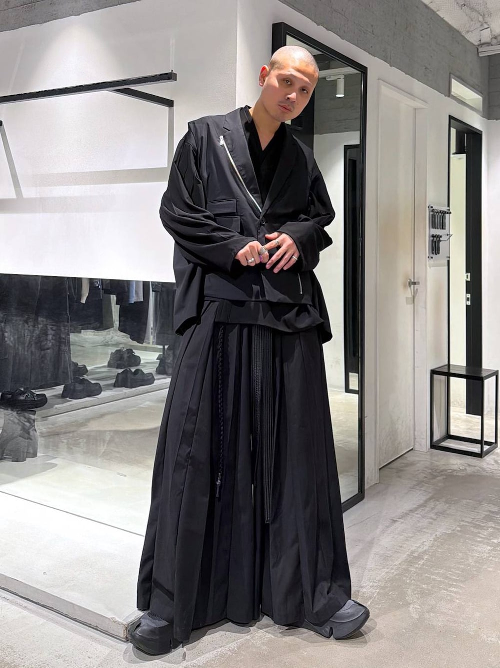 ◉ジャケット◉ 滑らかな肌触りと上品な光沢感がある汎用性の高い素材「CLEAR TEXTURE」。見頃や襟のジップパーツがアクセントになり、個性的な雰囲気に。袖を外すこともできてモードな着こなしや、外して半袖をレイヤードすれば夏でも着用できる! ◉カットソー◉ HAREから新ライン”NARRIL”が登場。柔道着から着想を得たジャポニズム感じるカットソー。落ち感がありモードに揺れる生地感が特徴。一枚着にも最適な程よいデザイン性です。 ◉パンツ◉ HAREの大人気シリーズ「YOSE」!!和モードなプリーツデザインがたまらない!!袴のようなディテールでシンプルなスタイリングにアクセントをつけてくれる!🔥かつデザインだけではなく、ワイドなので通気性もよく意外と快適!!✨