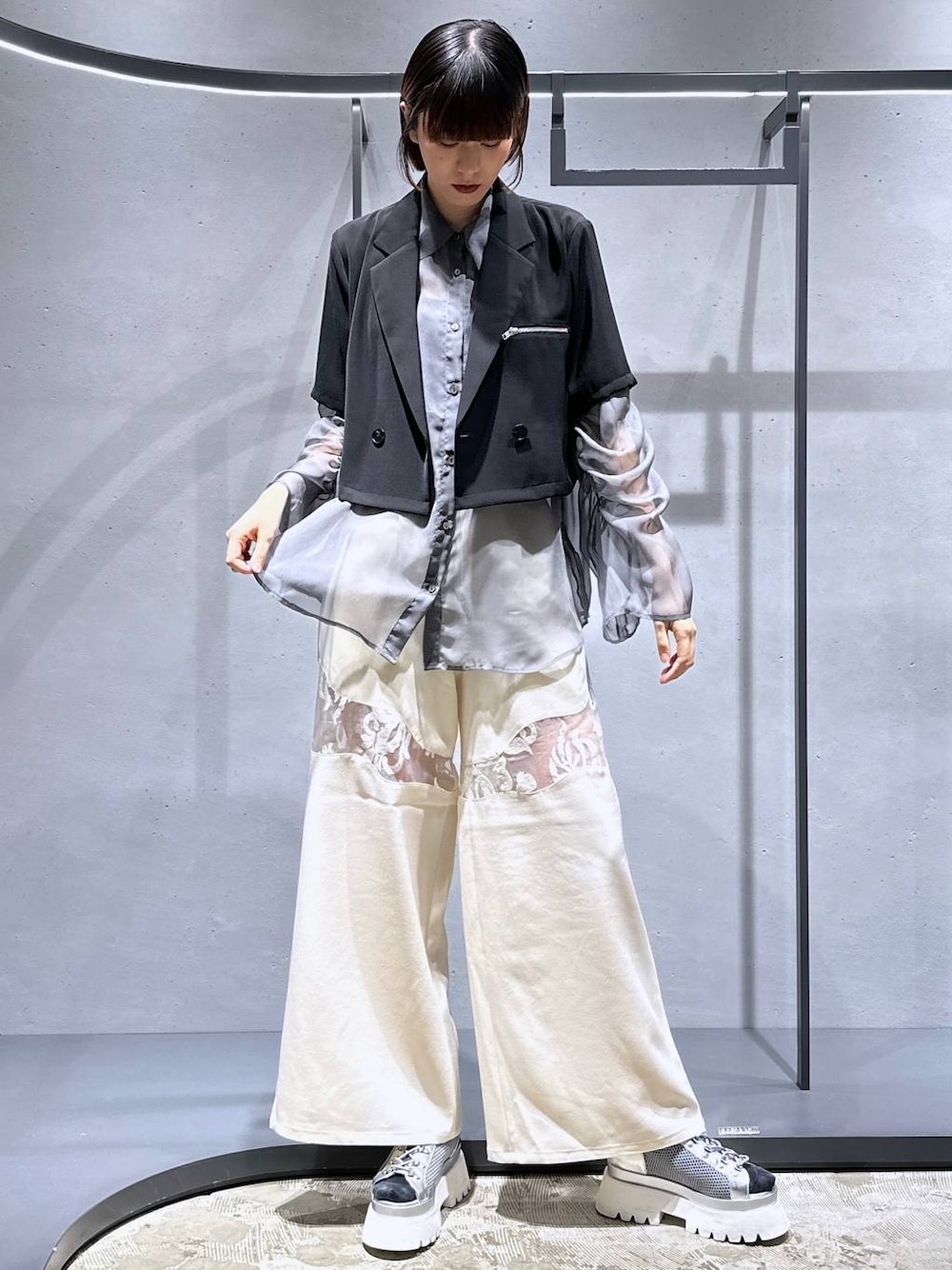 169㌢高身長女子 ショート丈を着たいけどお腹周りお尻周りが気になる人におすすめの着方です! ジャケット[トロミショートジャケット] トロミジャケットのショート丈ver登場🥰 華奢見え抜群の肩幅とスタイルアップ抜群の着丈! ダブルボタンなのでかっこいい印象は残しつつ女性らしいシルエットになります🫶 素材はトロミなのでサラサラ系で汗でベタつきにくいですよ♪ シャツ[ギャザーワイドシアーシャツ] 新作のシアーアイテム! 袖がギャザーになっていて可愛いです🫶 シフォン素材で柔らかく着心地も◎! 肩幅も気にせずきていただけますよ✨ パンツ[vintageシシュウキリカエパンツ] vintage シリーズ🪡 ワイドパンツシルエットで膝上〜太ももあたりにシアー刺繍がきます! オーガンジーのシアーなので脚のシルエットがぼやけて細見えしてくれます✨✨✨ 透け感は黒>グレー>白です! 丈感は私の身長で落として履くと◎