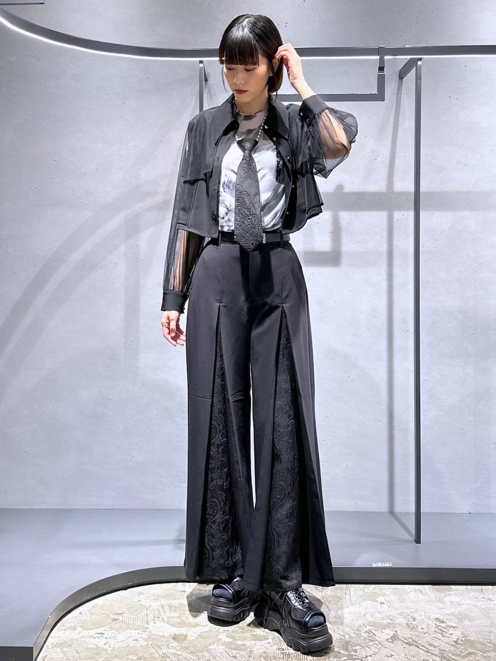 169㌢高身長女子 【アイテム詳細はタグor下のアイテムからcheck】 ユニバがチェンソーマンとコラボするとのことなのでマキマさんコーデ! シャツ[シアーレイヤードシャツ] 袖がシアーになっているデザイン性抜群のシャツ! ◉身頃がレイヤードになっていて立体感🙆 ◉ショート丈なのでスタイルアップもします♪ ◉軽い着心地で羽織り出来るとより涼しく着れます🫶 襟が大ぶりなのでアクセントにもなりますよね☺︎ パンツ[センタージャガードワイドパンツ] センタータック部分がジャガード素材になっていてデザイン性◎のワイドパンツ❗️ ◉丈長めなので高身長さんにもおすすめです🫶 ◉着心地は夏でも快適に過ごせそうなサラッとした感じでした! 脚長効果抜群です🥰