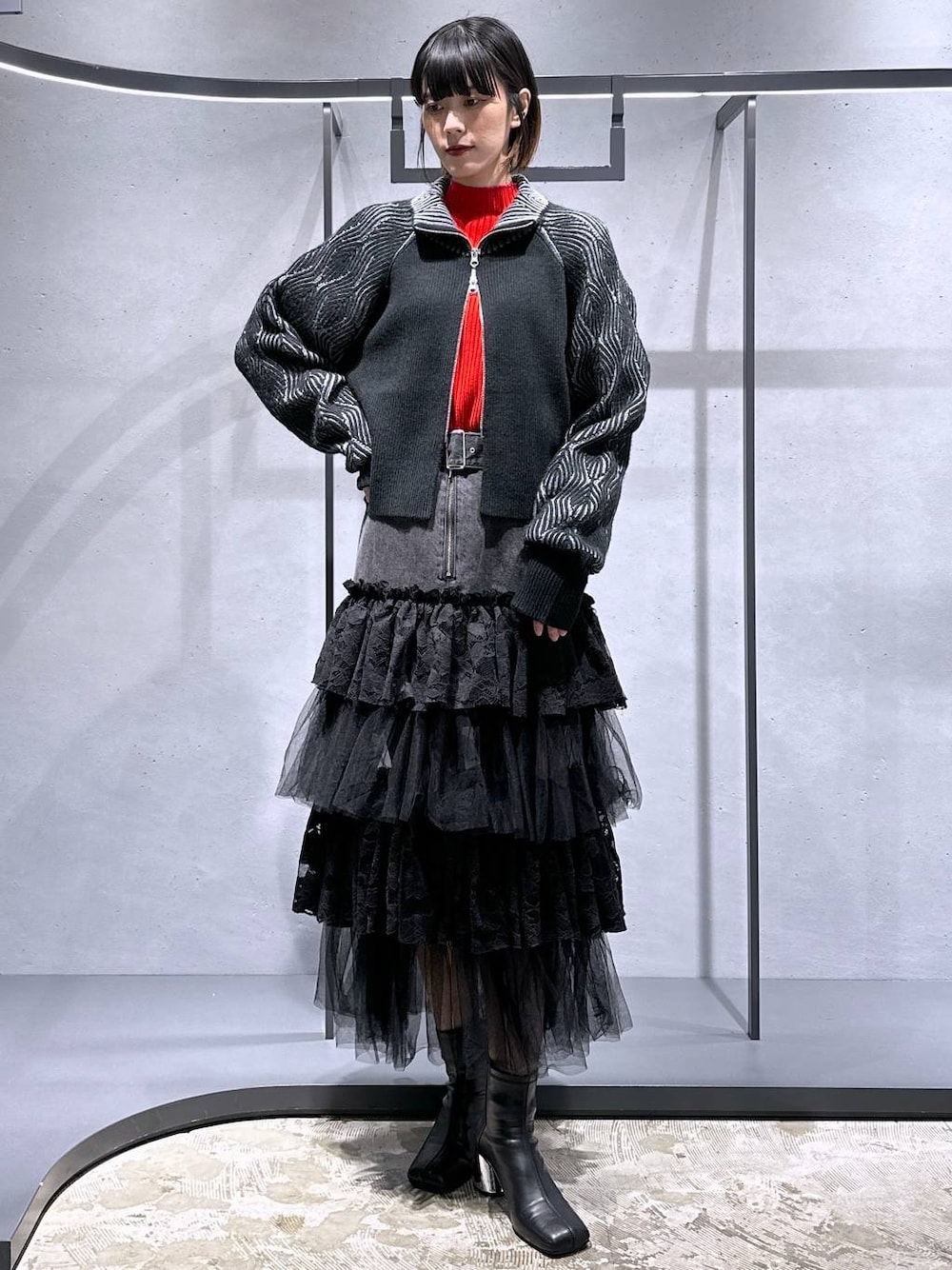 【アイテム詳細はタグor下のアイテムからcheck】 ニット[ハイショクジップニットカーディガン] スポーティさも兼ね備えていて個人的ドストライク🎯 ◉ラグランスリーブで肩幅気にせず着れます🫶 ◉袖丈長めでボリュームもあるので少しクシュっとするのも可愛いです! ◉厚手のニットでもちもちした感触!チクチク感0! かなり保温性に優れているので真冬、いけます。 インナー[ハイショクリブタイトニットプルオーバー] 前後でリブの太さが違うのでお好きな方前で楽しめます! ◉チクチク感0の柔らかリブインナー✨ ◉袖にアクセントカラーが付いているのでこれからの重ね着の季節に持ってこいです! ◉リブインナーの中ではゆとりがあるほう🫶 スカート[デニムレースチュールスカート] まさにかっこいいとかわいいの共存item🤍🖤 ◉デニムは少し硬めのしっかりとした素材です! ◉チュールは沢山使われているので立体感あるシルエットになります🫶 ◉太ももあたりからチュールが始まるので骨盤が大きく見えたりはしないのでご安心を☺️ ◉足透けはチュールの2段目から透けます!