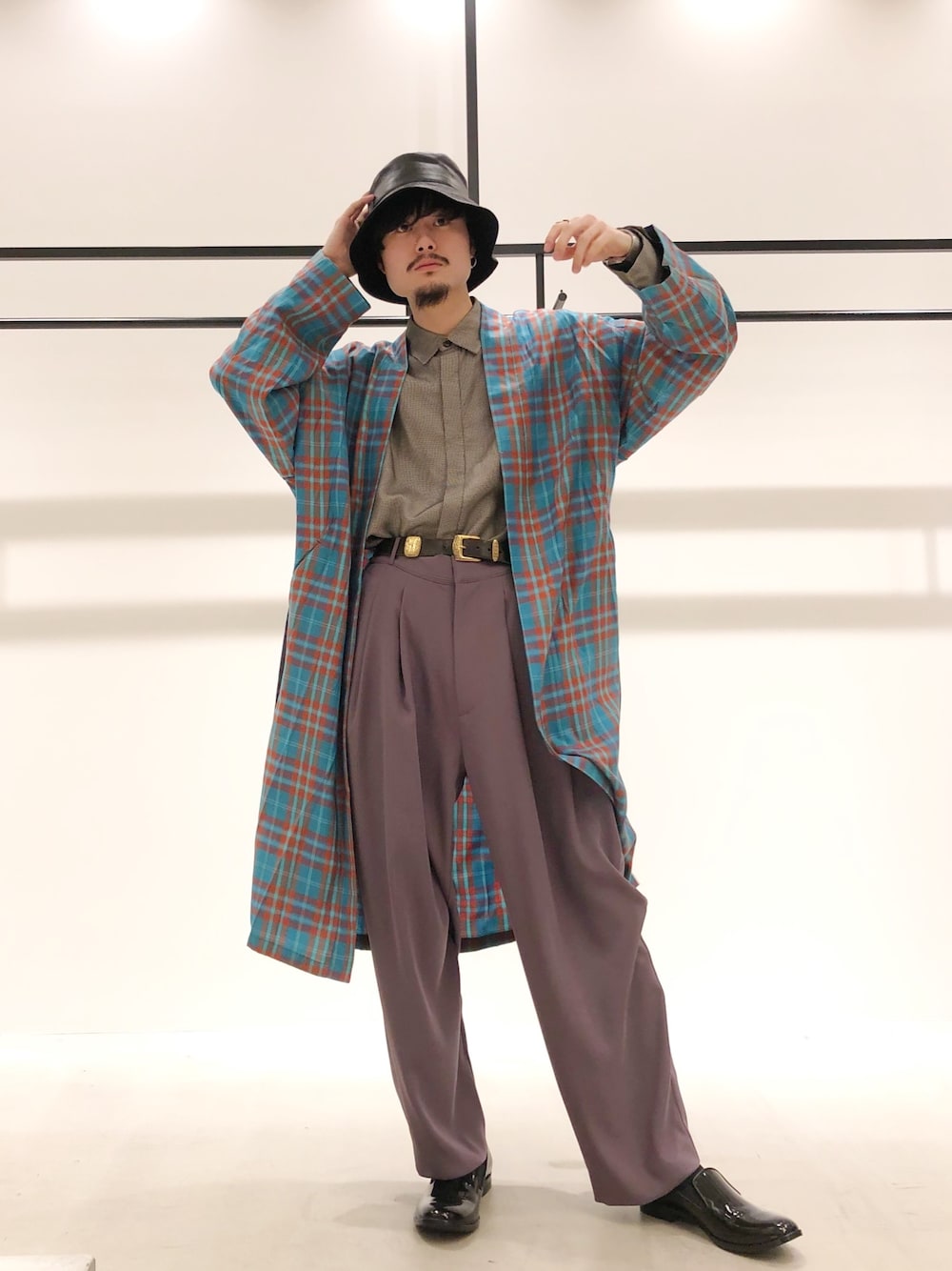 KOU SUEMATSU(Lui's/EX/store TOKYO)のトレンチコート「キュプラチェックロングガウンシャツコート」を使ったコーディネート