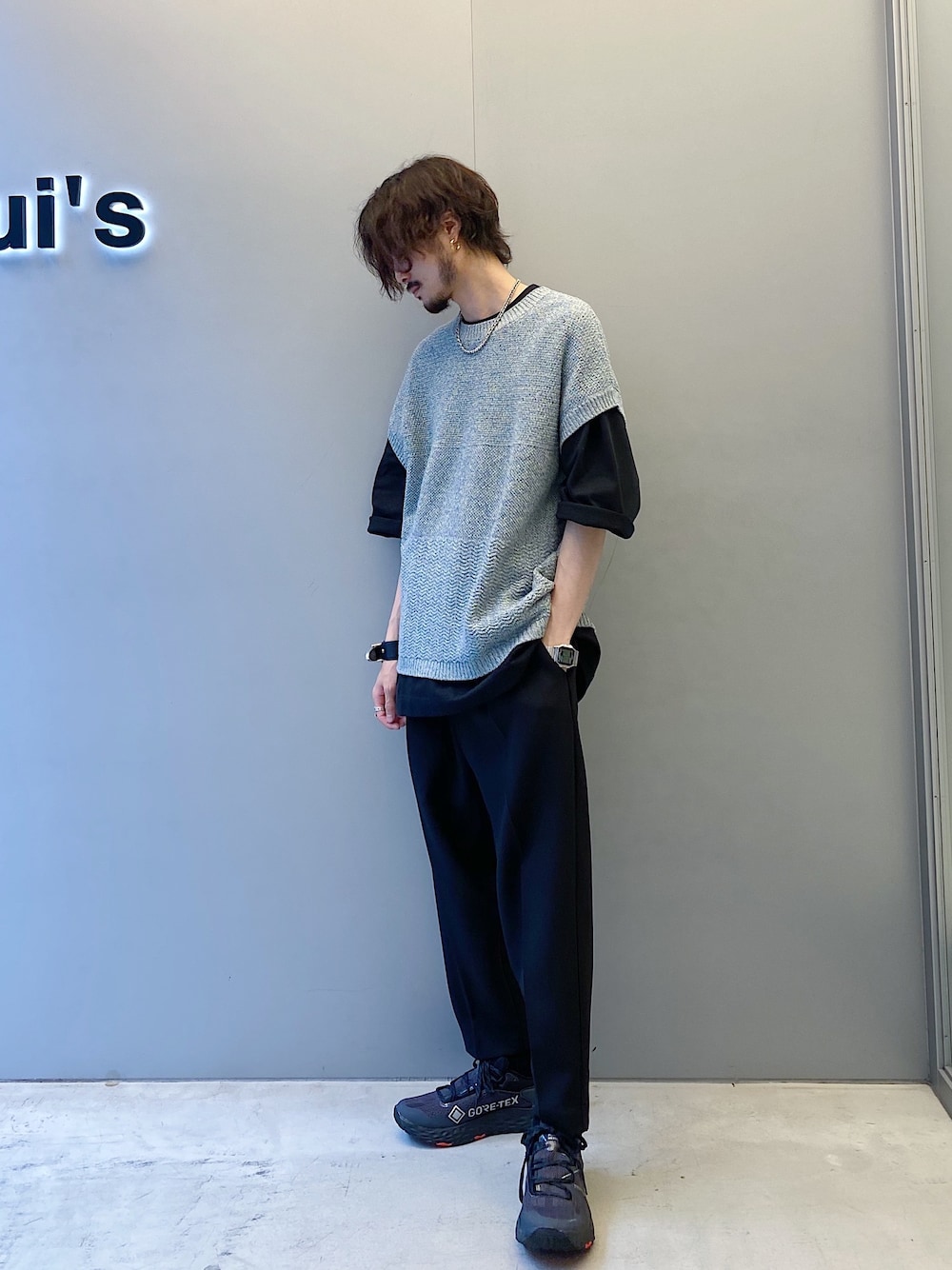 KOU SUEMATSU(Lui's/EX/store TOKYO)のベスト「ミックスワイドニットベスト」を使ったコーディネート